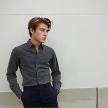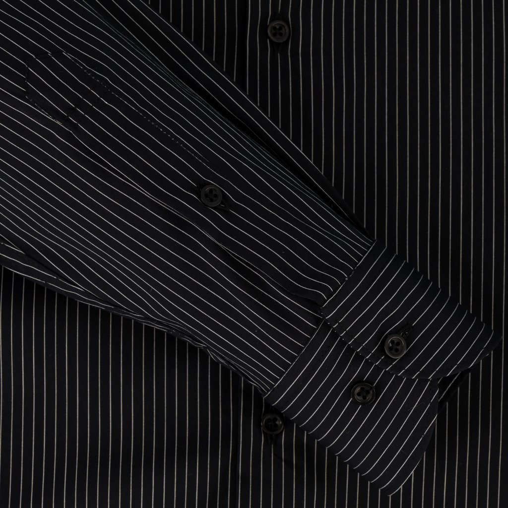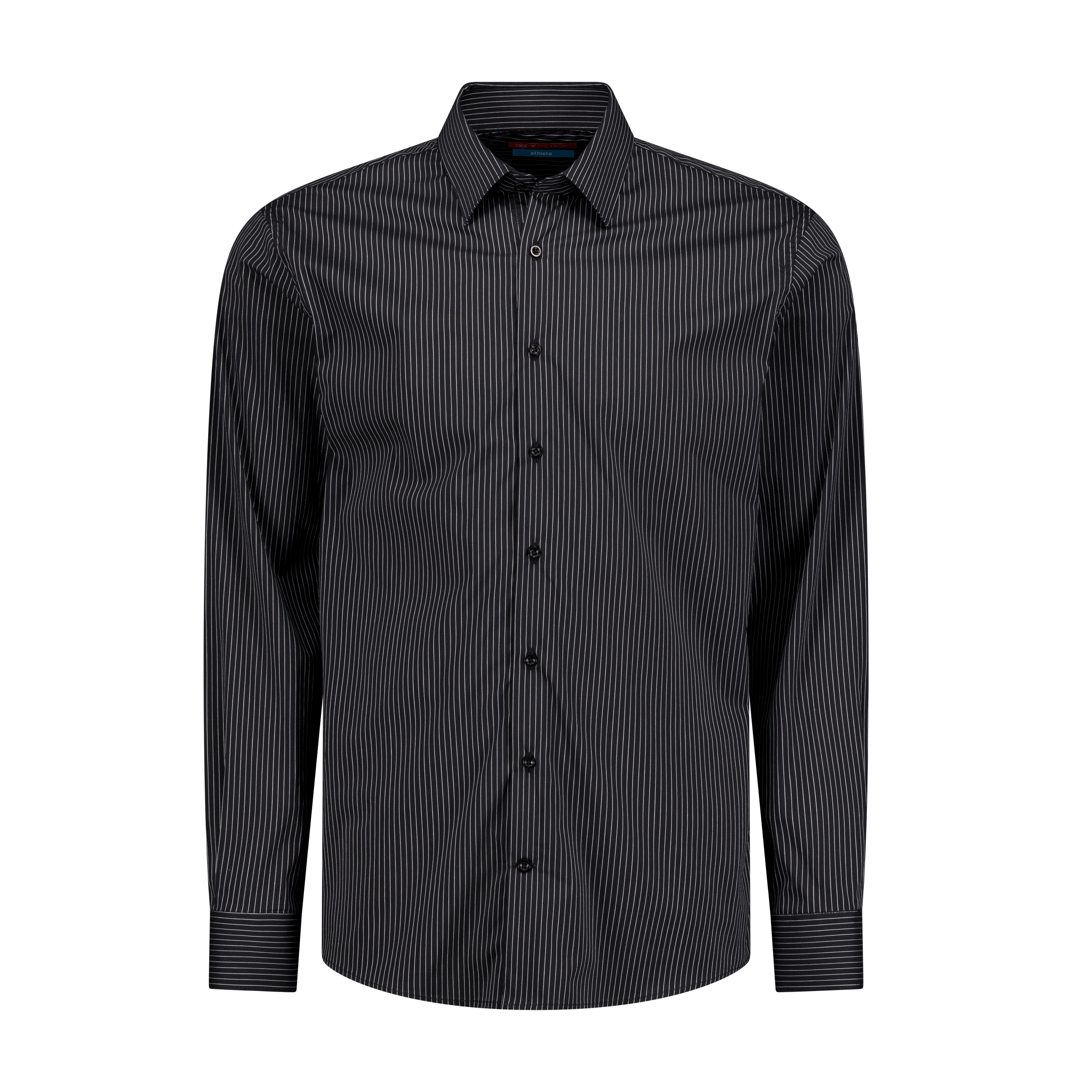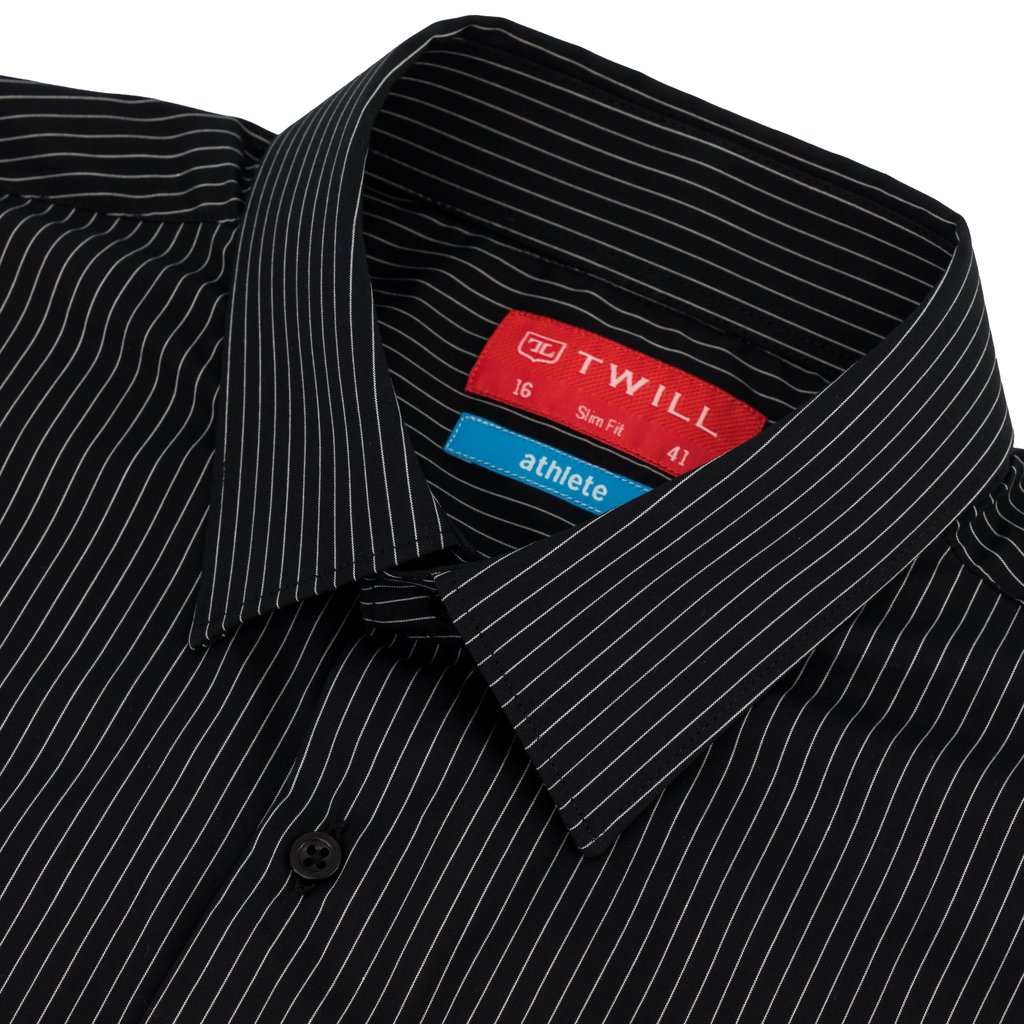 Crafted from a cotton-stretch blend, this black pinstripe dress shirt from the Athlete Collection combines sophisticated style with enhanced flexibility. The slim fit design offers a tailored silhouette that complements an athletic build, while the black pinstripe pattern adds a polished, professional touch suitable for both business and formal settings. The semi cutaway collar, featuring fixed collar stays, ensures a crisp, contemporary appearance. Single cuffs provide a streamlined, versatile finish ideal for everyday wear. Engineered for convenience, this shirt is easy to iron and care for, making it perfect for the active gentleman. Machine wash at 30°C for effortless maintenance. A dynamic, stylish addition to any modern wardrobe.