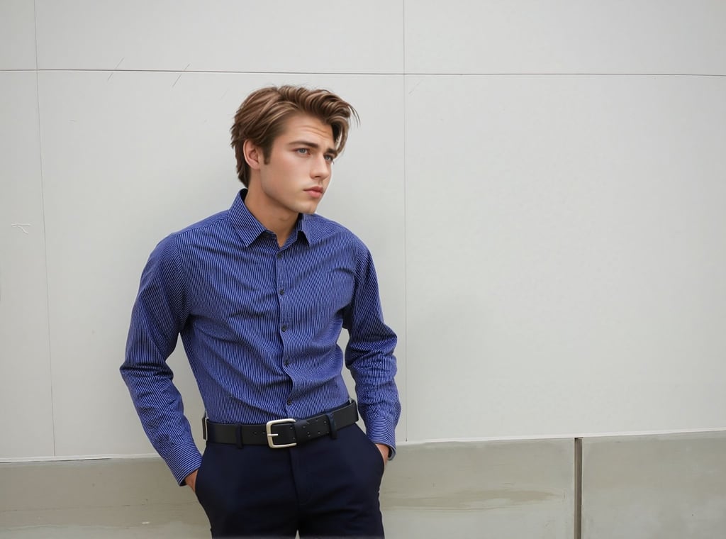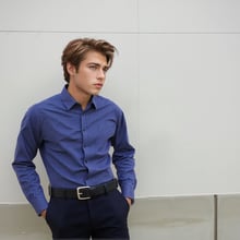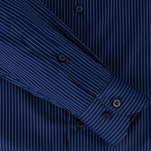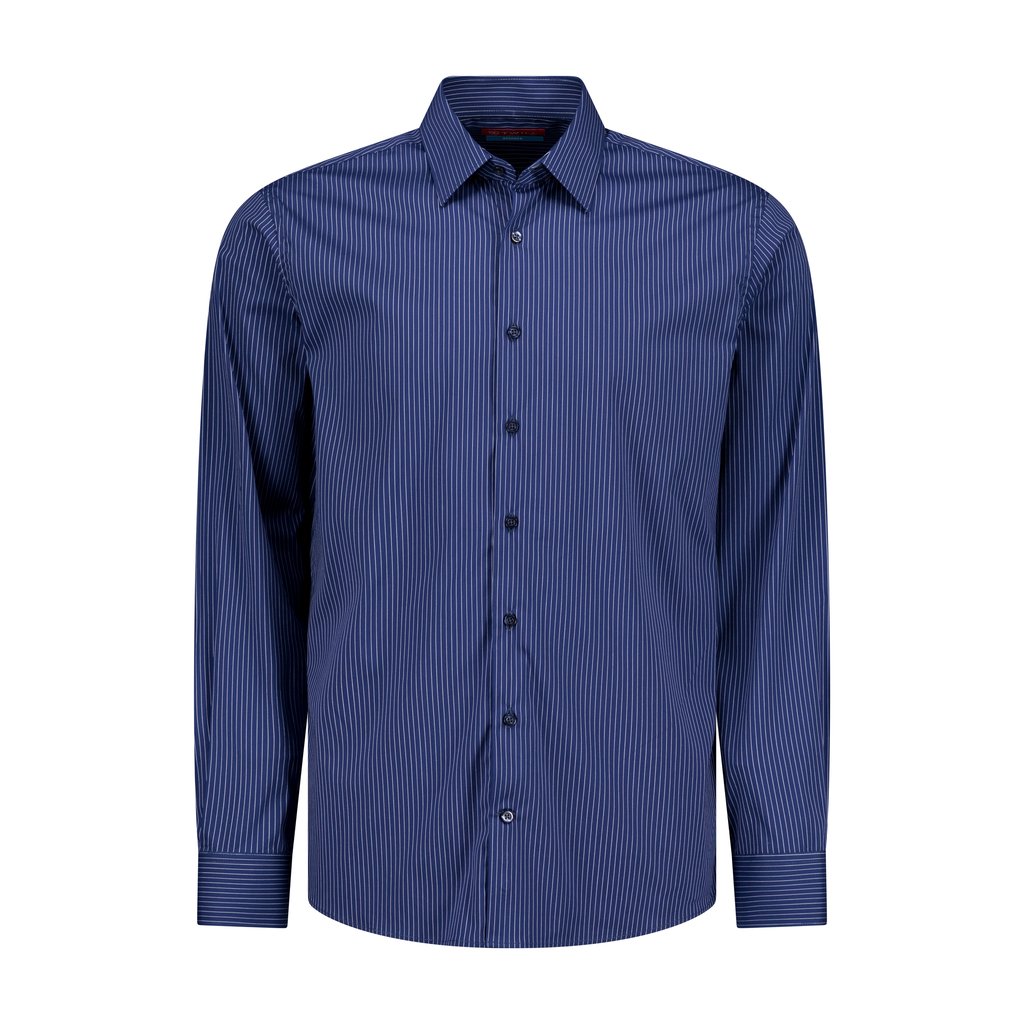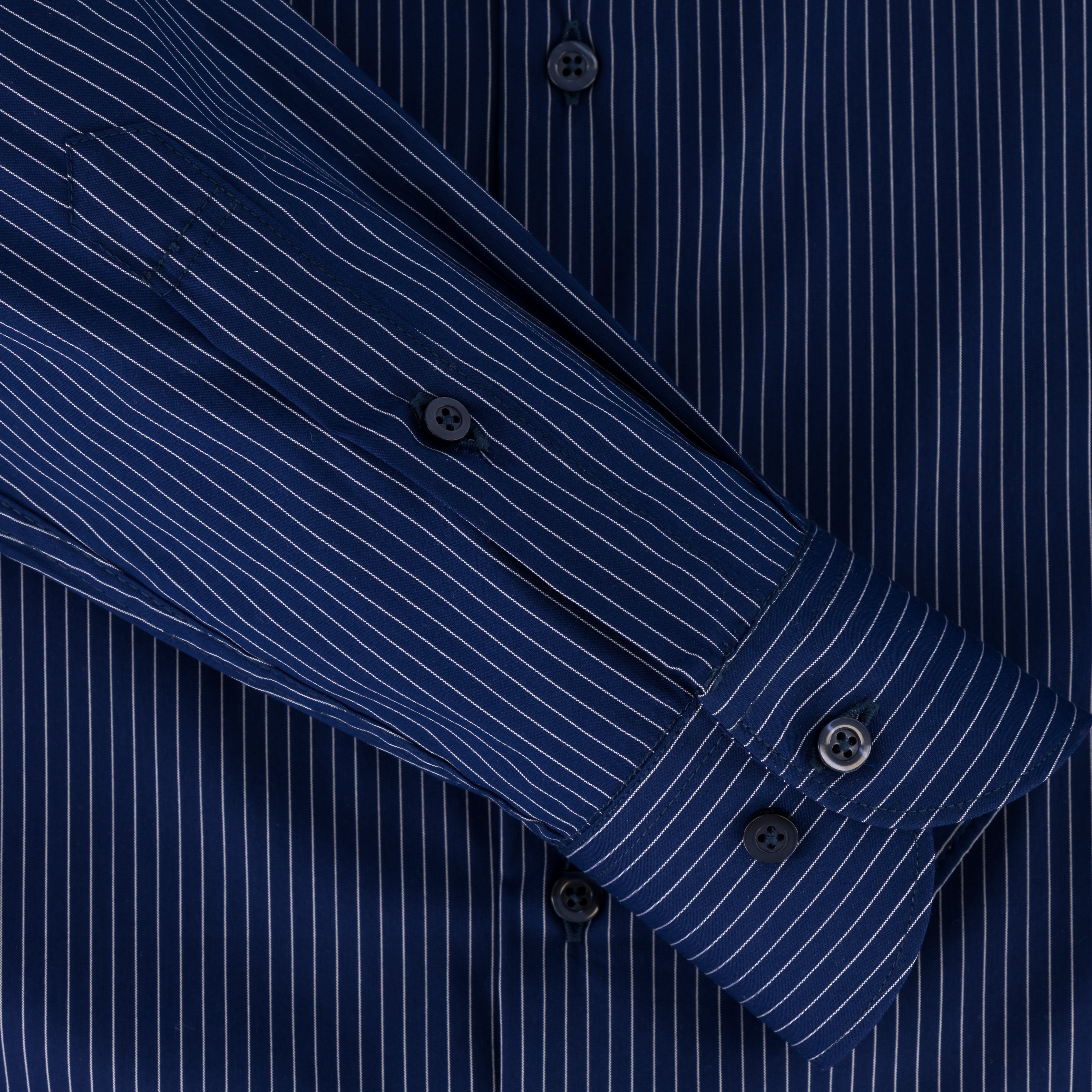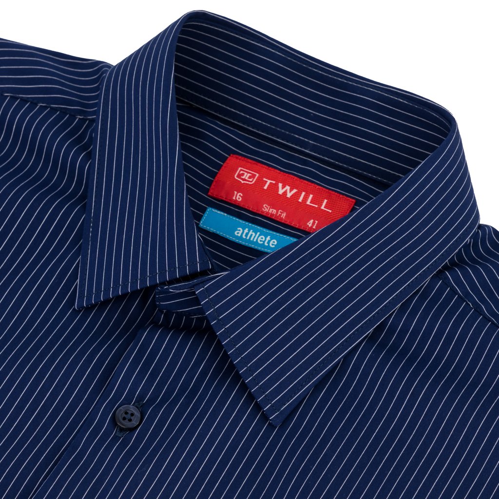 This navy pinstripe dress shirt, crafted from a cotton-stretch blend, is a standout piece from the Athlete Collection, blending refined style with practical functionality. The slim fit design creates a sleek, tailored silhouette ideal for an athletic build, while the navy pinstripe pattern offers a timeless, professional aesthetic suitable for business or formal occasions. The semi cutaway collar, equipped with fixed collar stays, ensures a crisp, contemporary look. Single cuffs provide a streamlined, versatile finish perfect for daily wear. Designed for ease, this shirt is easy to iron and care for, catering to the needs of the active gentleman. Machine wash at 30°C for effortless maintenance. A sophisticated, performance-driven addition to any modern wardrobe.