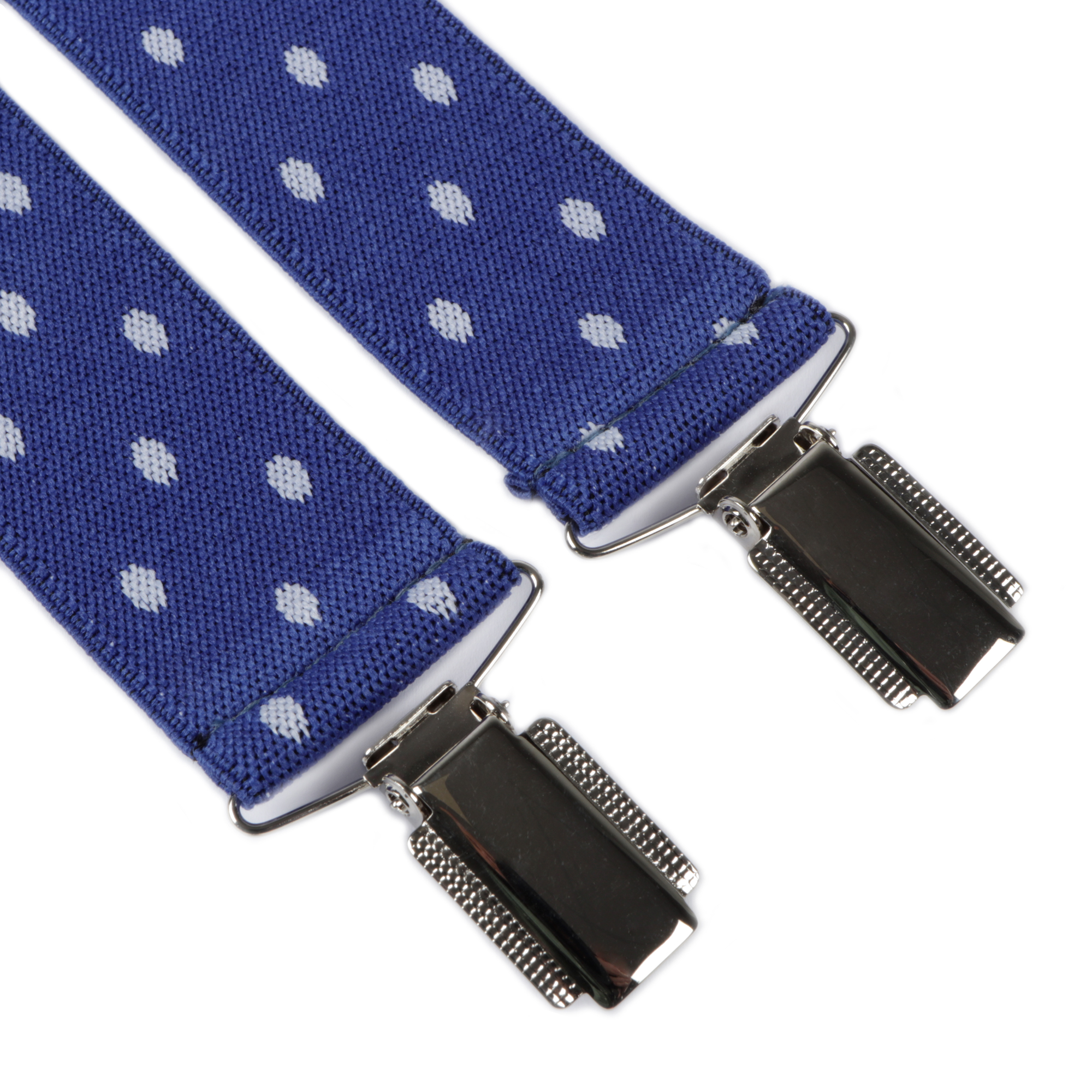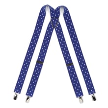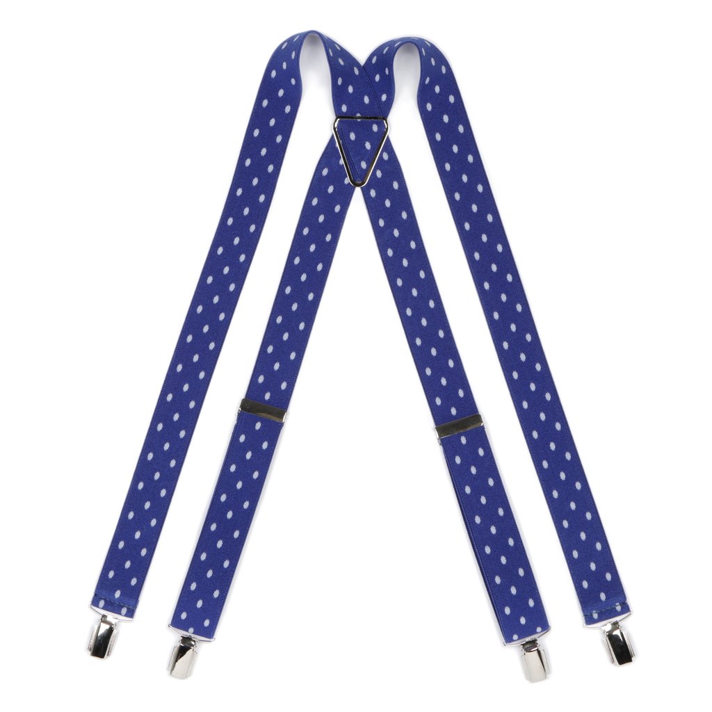 Add a playful touch to your outfit with these blue polka dot print braces. The four clip design ensures a secure fit, while the polished silver clips add a touch of sophistication. The elasticated straps offer comfort and flexibility, making these braces a one size fits all choice.