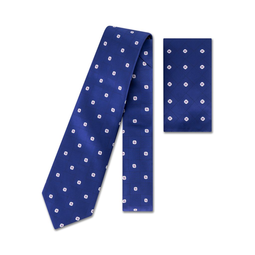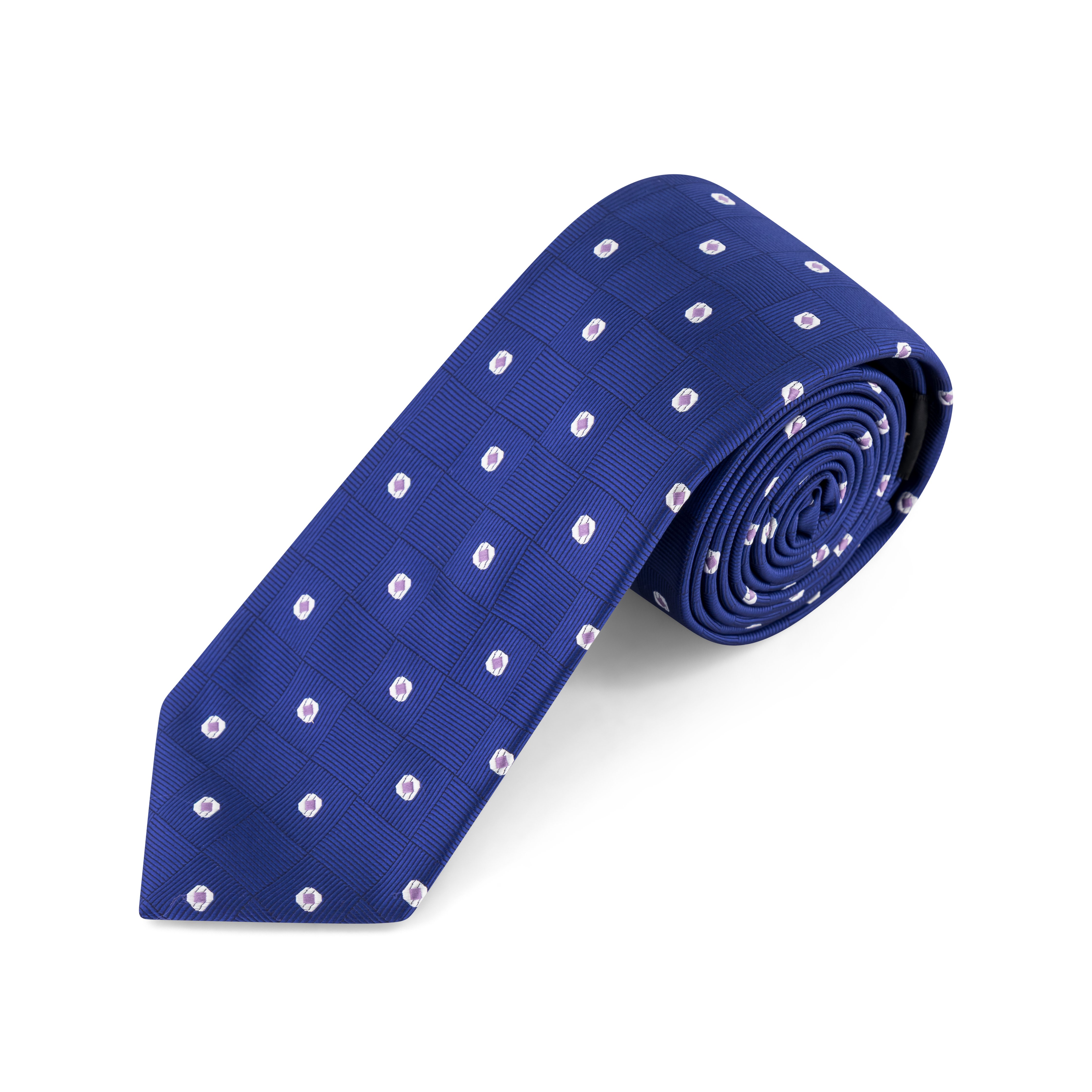 Elegant and distinctive, this tie features a rich blue base with a subtle checkered weave and a repeating pattern of small white oval dots, each accented with a hint of purple at the center. The refined colour palette and structured layout make it a versatile choice for formal occasions or standout business wear.