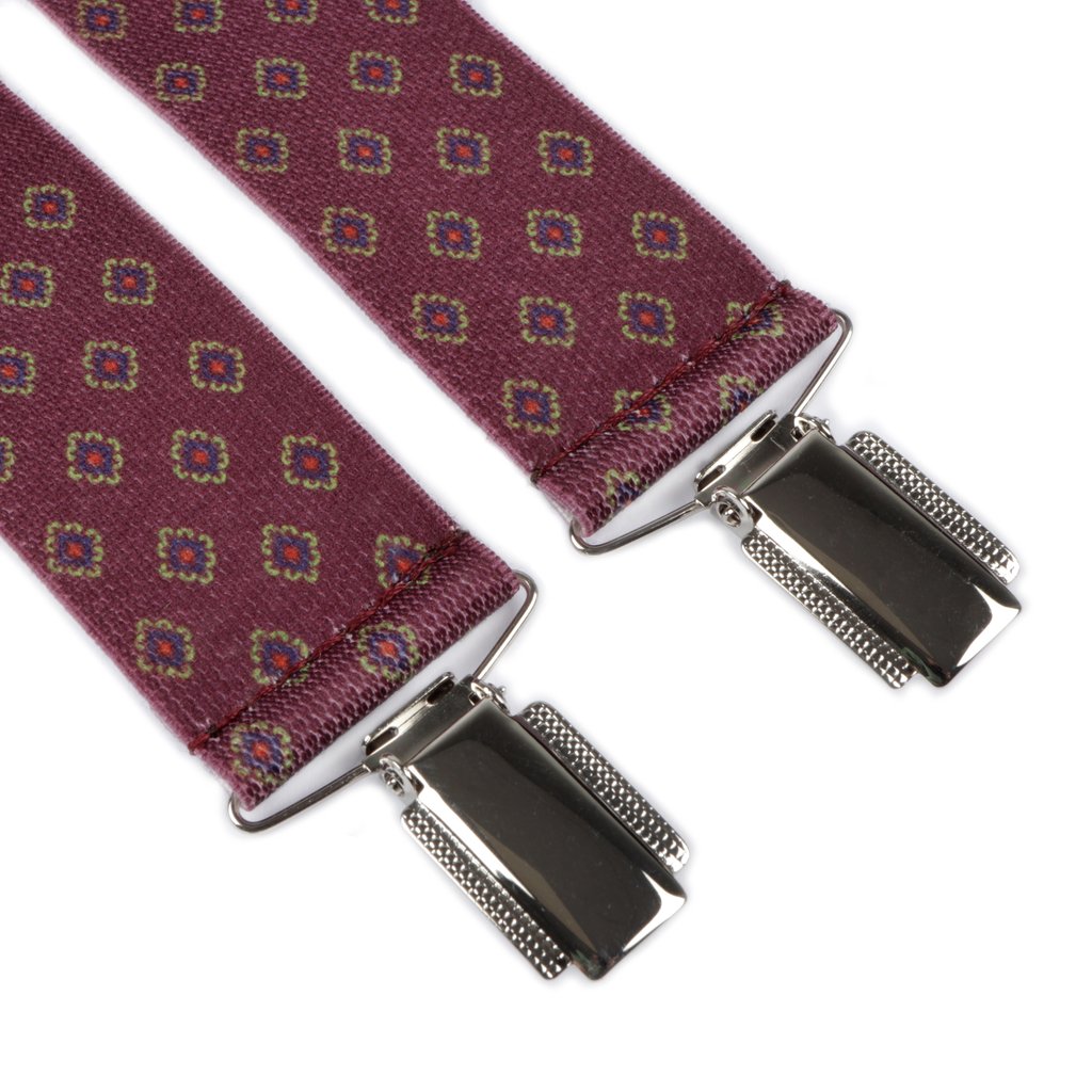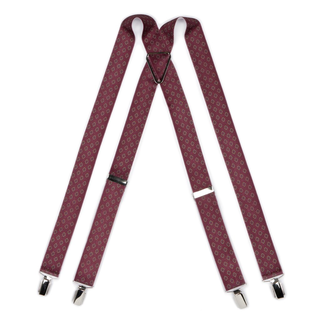 Make a statement with these burgundy geometric print braces. The four clip design ensures a secure fit, while the polished silver clips add a touch of sophistication. The elasticated straps offer comfort and flexibility, making these braces a one size fits all choice.