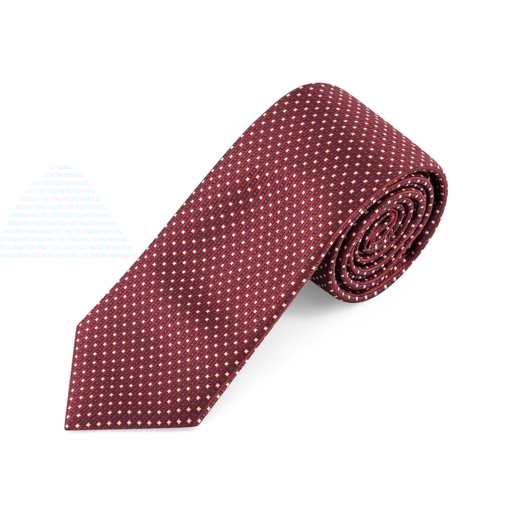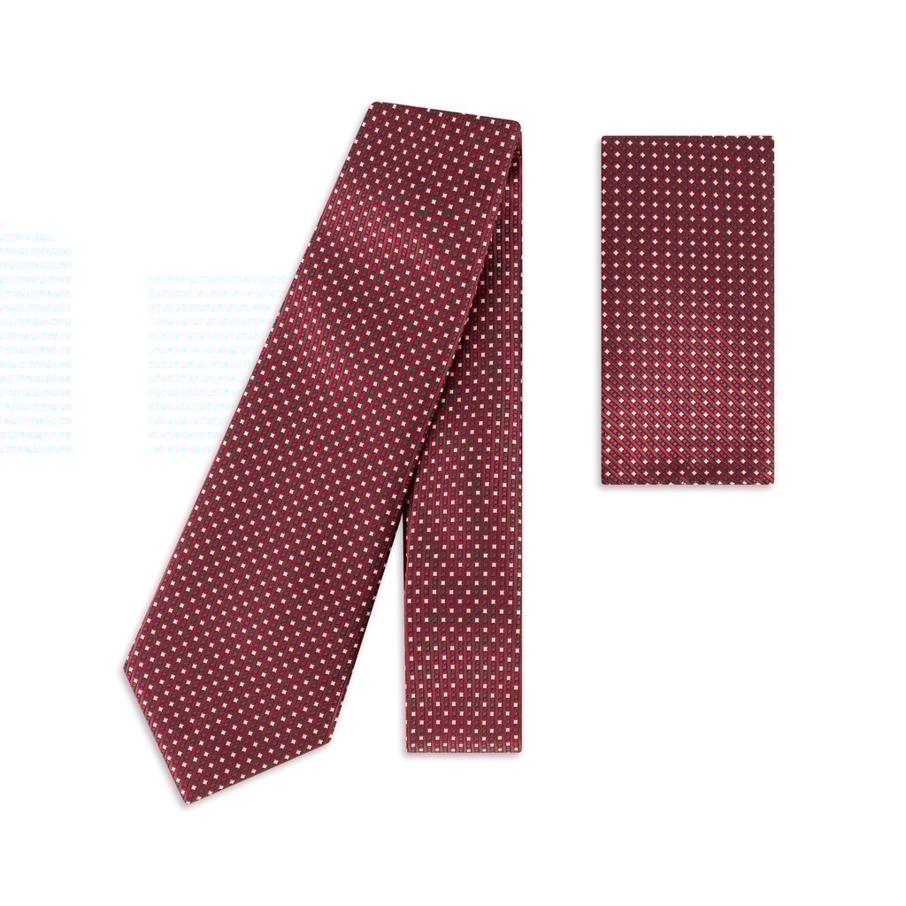 Enhance your formal repertoire with the Burgundy with White and Charcoal Woven Squares Tie and Matching Pocket Square Set, a masterful blend of tradition and modern flair. Expertly woven from 100% premium microfibre, this set delivers a sumptuous texture and lasting resilience, featuring a lush burgundy foundation enlivened by a striking pattern of white and charcoal squares. The tie, with its 7.5cm width and 150cm length, offers a classic yet versatile silhouette, perfect for distinguished occasions or sharp professional attire. Complemented by a matching pocket square, this ensemble ensures a harmonious and sophisticated finish. Maintain its pristine condition with the option of hand washing, though dry cleaning is advised for the finest preservation. Ideal for the gentleman who values both heritage and bold distinction in his wardrobe.