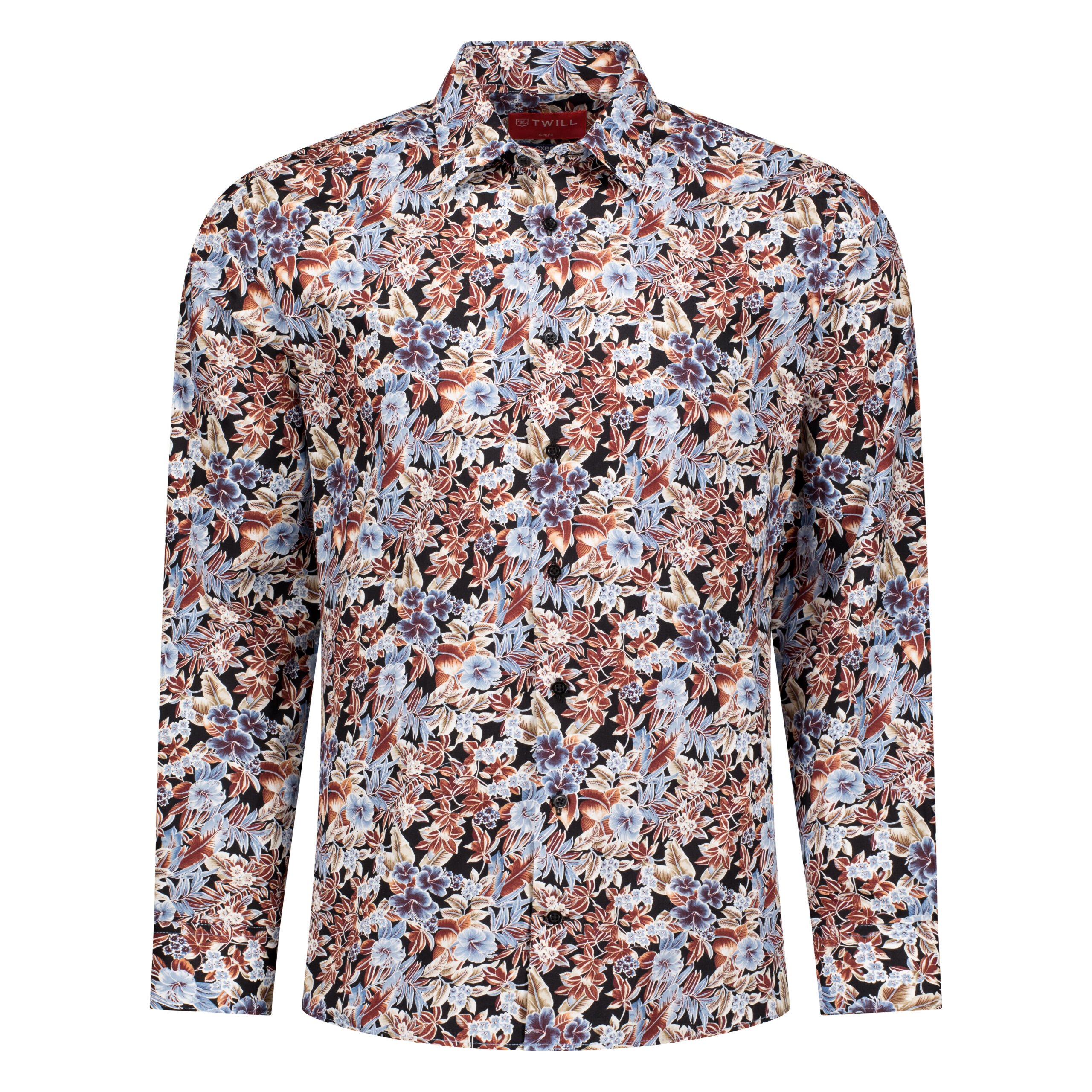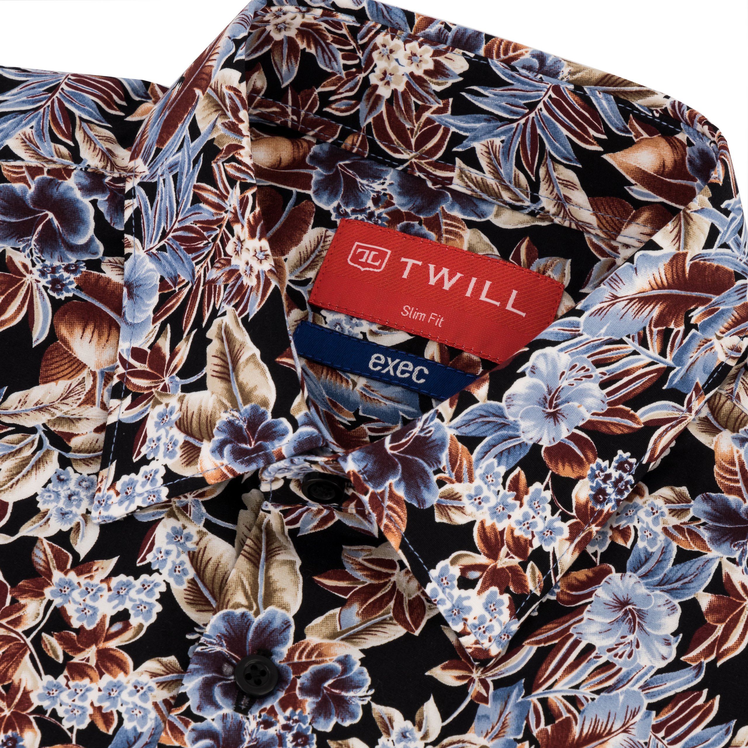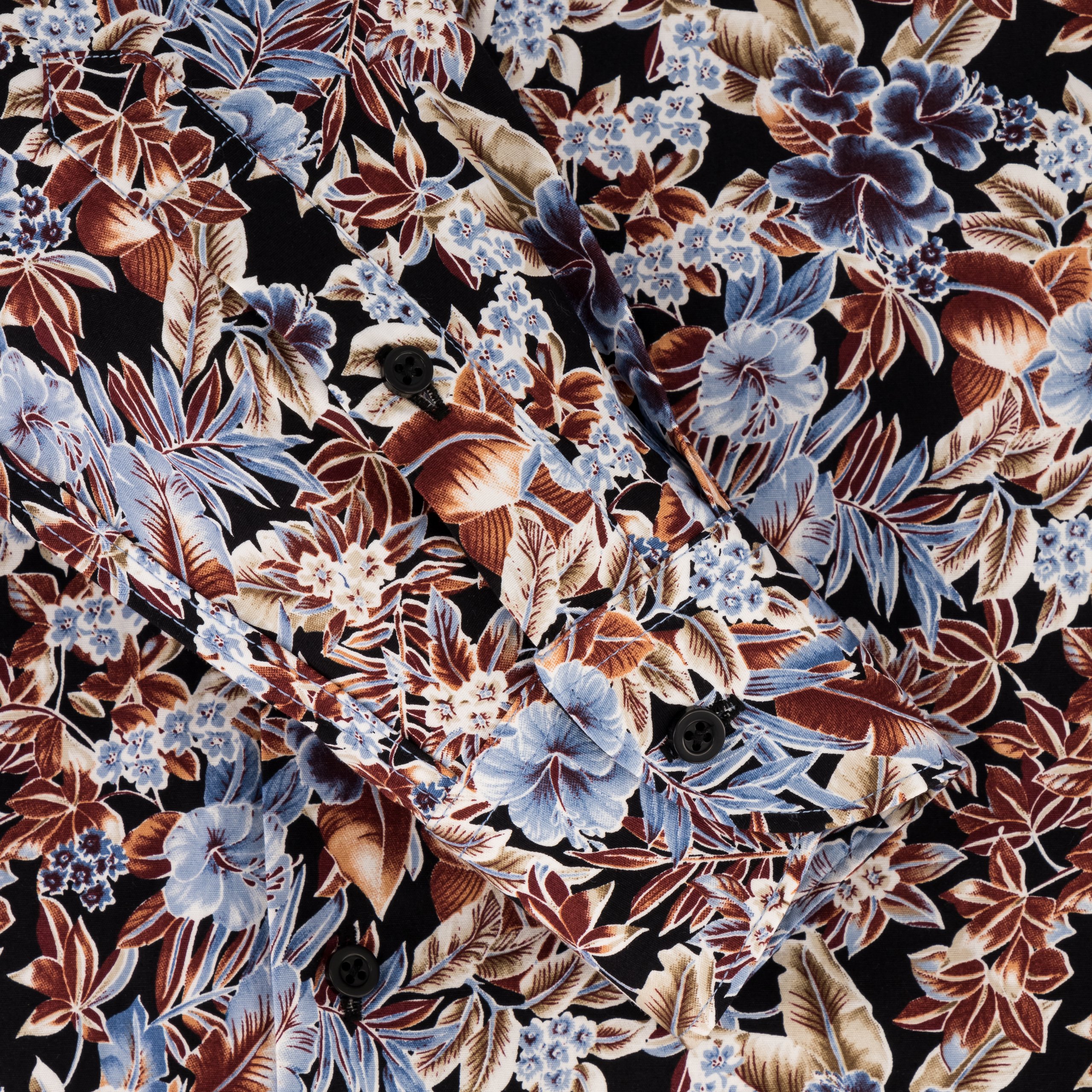 Step into sophistication with this floral-printed black dress shirt from the Exec Collection, where art meets executive style. This shirt showcases a vibrant floral pattern in a palette of soothing blues, browns, and whites, all set against a midnight black background, offering a striking yet refined look. Crafted from superior cotton, it guarantees both comfort and durability, making it an ideal choice for the busy professional who values quality in their attire. The semi-cutaway collar provides a contemporary twist to the classic shirt design, enhancing the visual appeal of the floral print. Single cuffs maintain a traditional elegance, while the bonded collar stays ensure the shirt retains its crisp appearance throughout the day. With a slim fit that contours to the body, this shirt is perfect for those who seek to make a subtle yet powerful statement in any professional setting. It’s machine washable at 30 degrees for convenience, and for an impeccable finish, ironing whilst damp is recommended. This shirt isn’t just clothing; it’s an investment in your professional and personal style.
