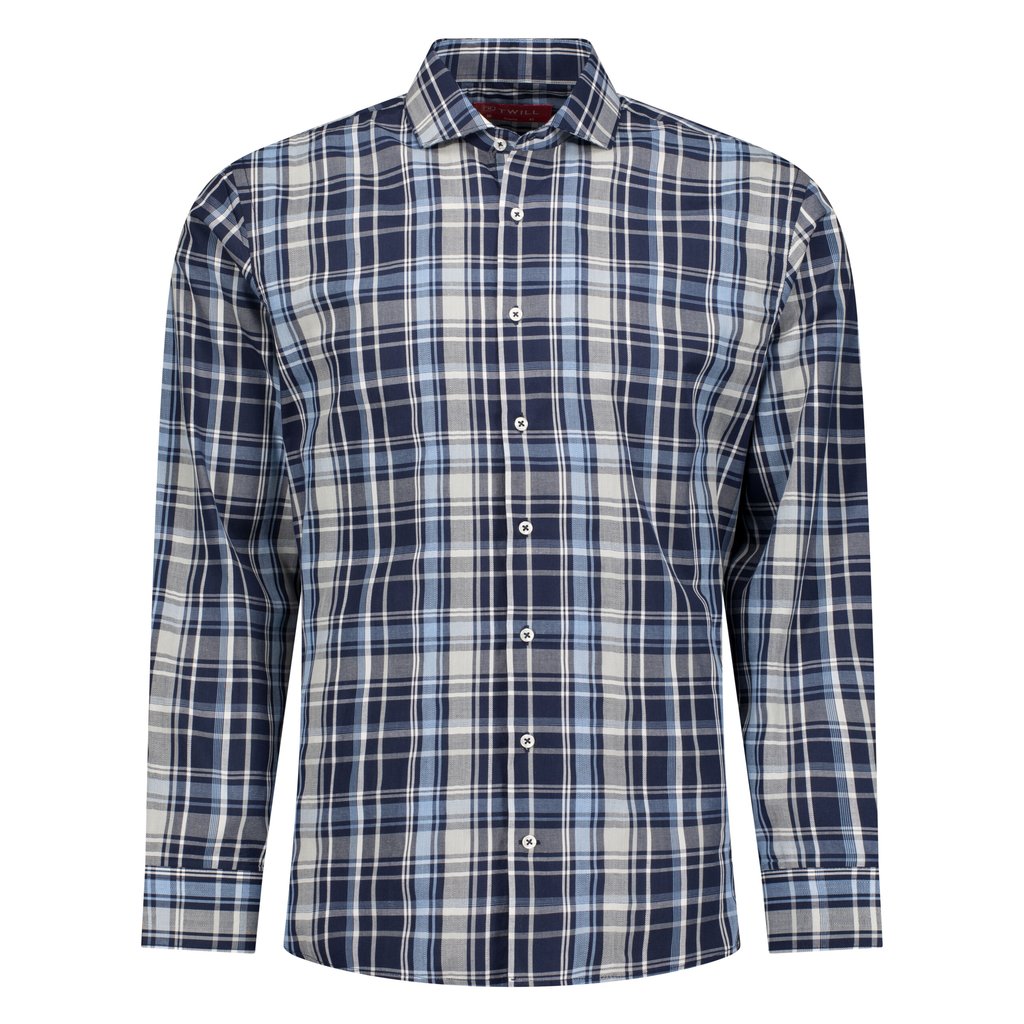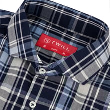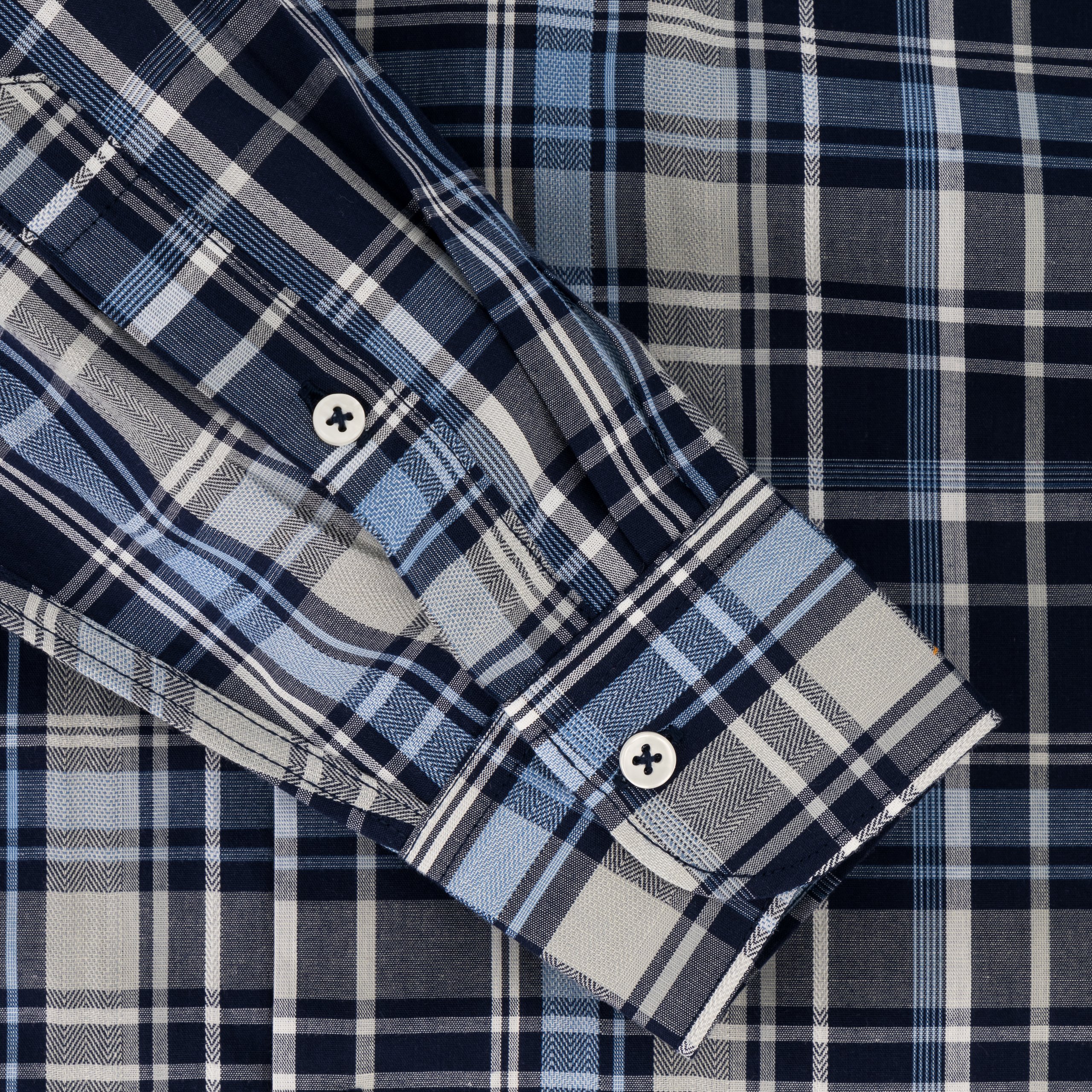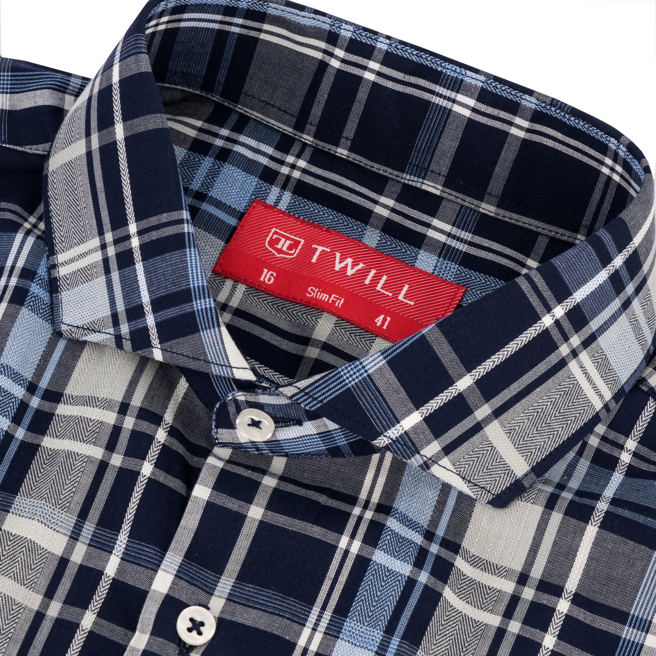 Make a statement with this slim fit navy and cream check dress shirt, designed for the man who isn’t afraid to stand out. Made from 100% cotton, this shirt offers comfort alongside a vibrant, eye-catching pattern that’s perfect for adding a splash of personality to any formal or semi-formal outfit. The slim fit ensures a flattering, contemporary silhouette, while the full cutaway collar provides a modern, bold look. Single cuffs maintain the shirt’s versatility for day-to-day wear, and the bonded collar stays keep the collar structured and sharp all day. This shirt is easy to care for, being machine washable at 30 degrees; for an impeccable finish, simply iron while the fabric is damp. Whether for business or pleasure, this shirt is an excellent choice for those who appreciate both style and substance.