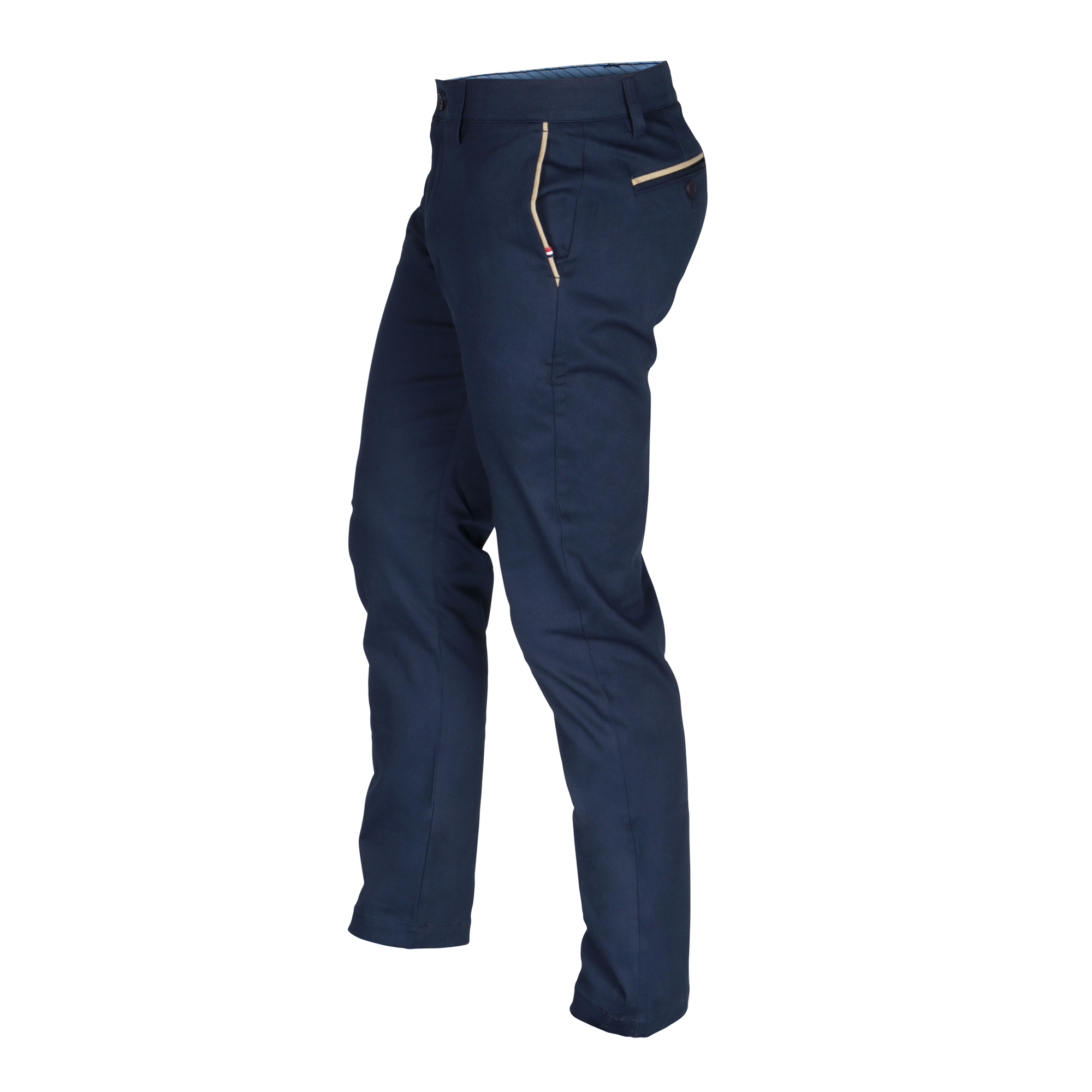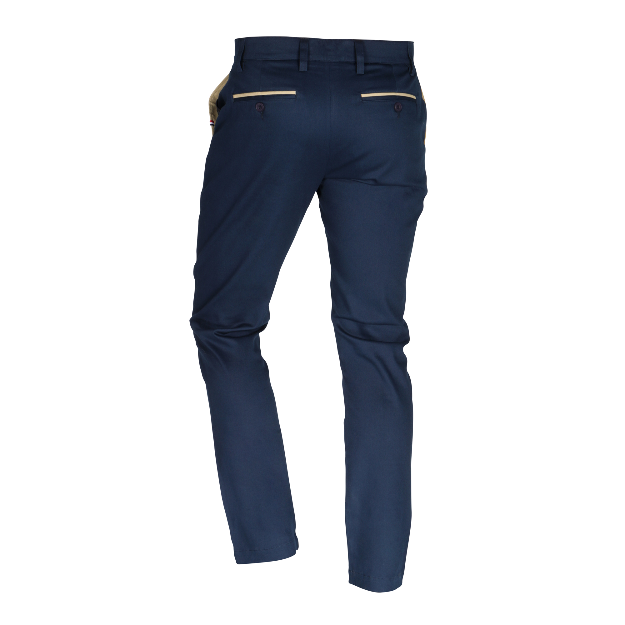 Stay stylish and stress-free with our navy easy care chino trousers. Featuring a slim fit design, 4-pocket style, and contrasting pocket trim, these trousers are crafted from cotton stretch for comfort and durability. The easy care fabric ensures a low-maintenance wardrobe essential.