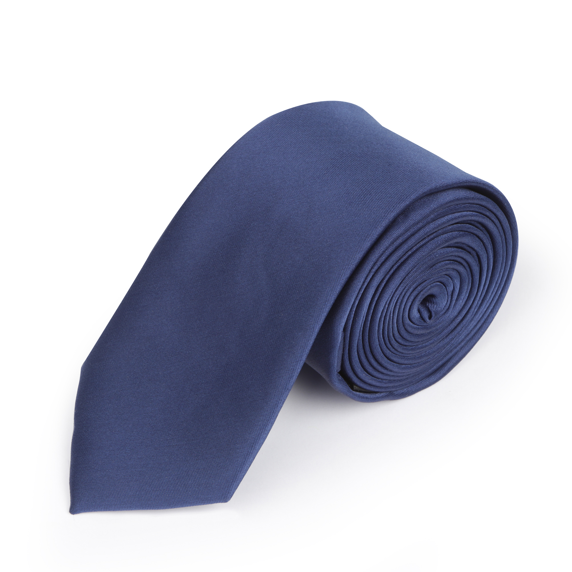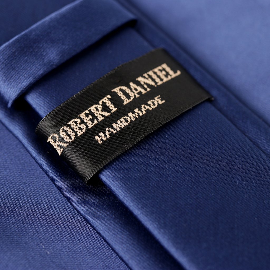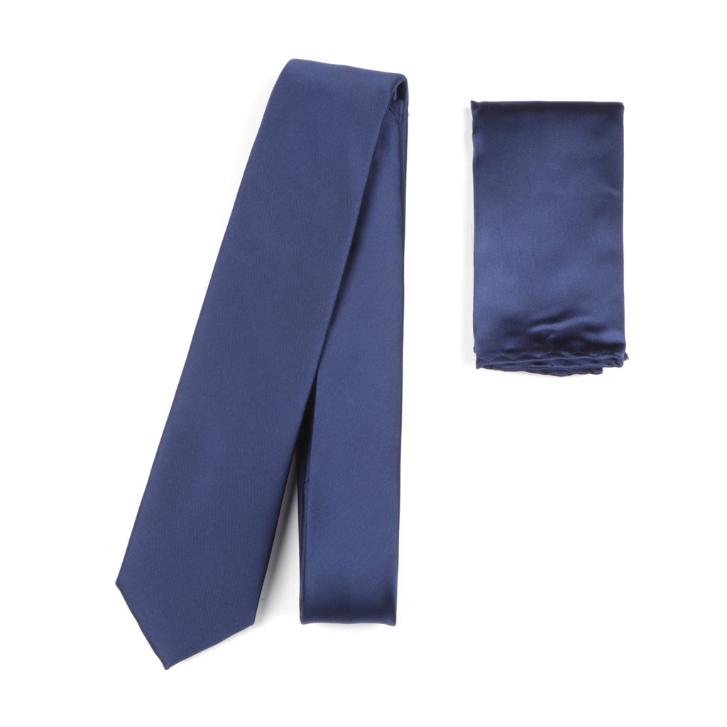 A satin finish microfiber tie in navy, paired with a matching pocket square of the same material. The tie measures 150cm in length and 7.5cm in width, while the pocket square is a perfect square of 15cm x 15cm.