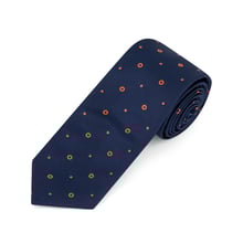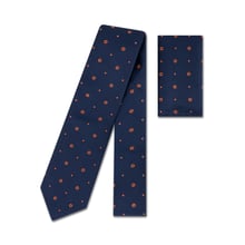A refined blend of classic and contemporary, this tie features a deep navy base adorned with small, evenly spaced orange dots. The vibrant contrast adds a touch of personality while maintaining a polished, versatile look—ideal for both formal events and standout office wear.