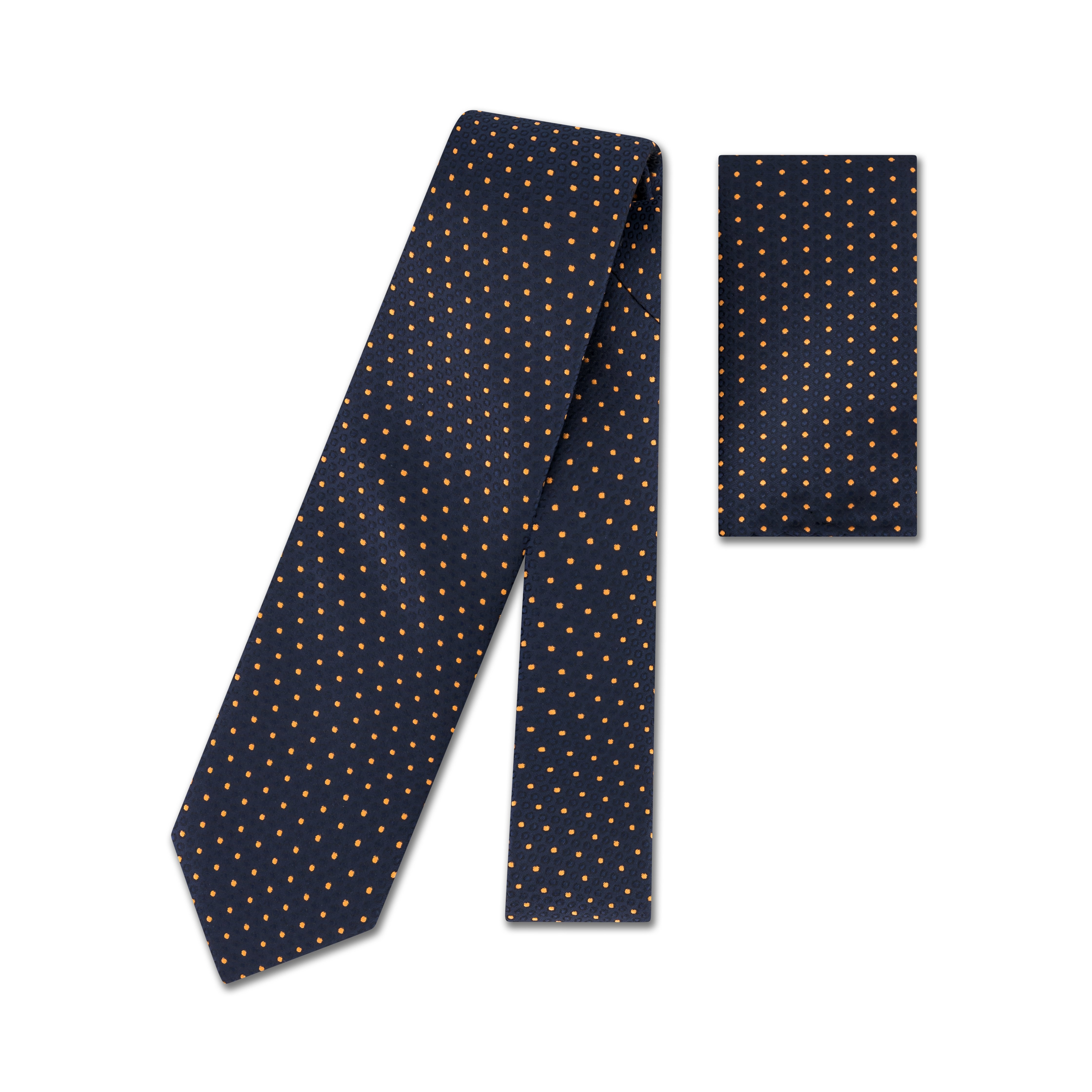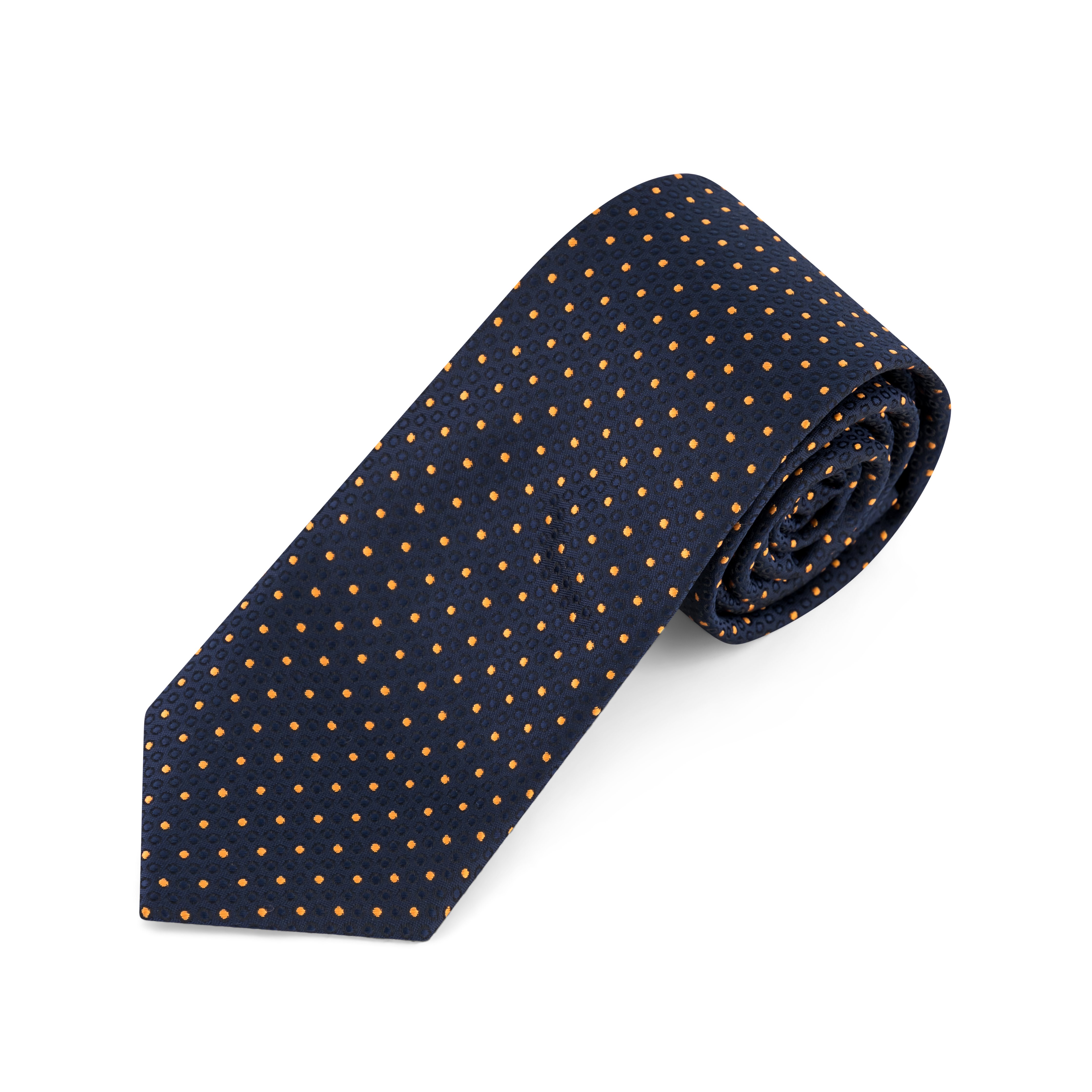 A bold twist on a timeless classic, this tie features vibrant orange polka dots set against a deep navy background. The playful contrast adds personality without compromising on sophistication—perfect for making a confident statement at formal events or in the office.