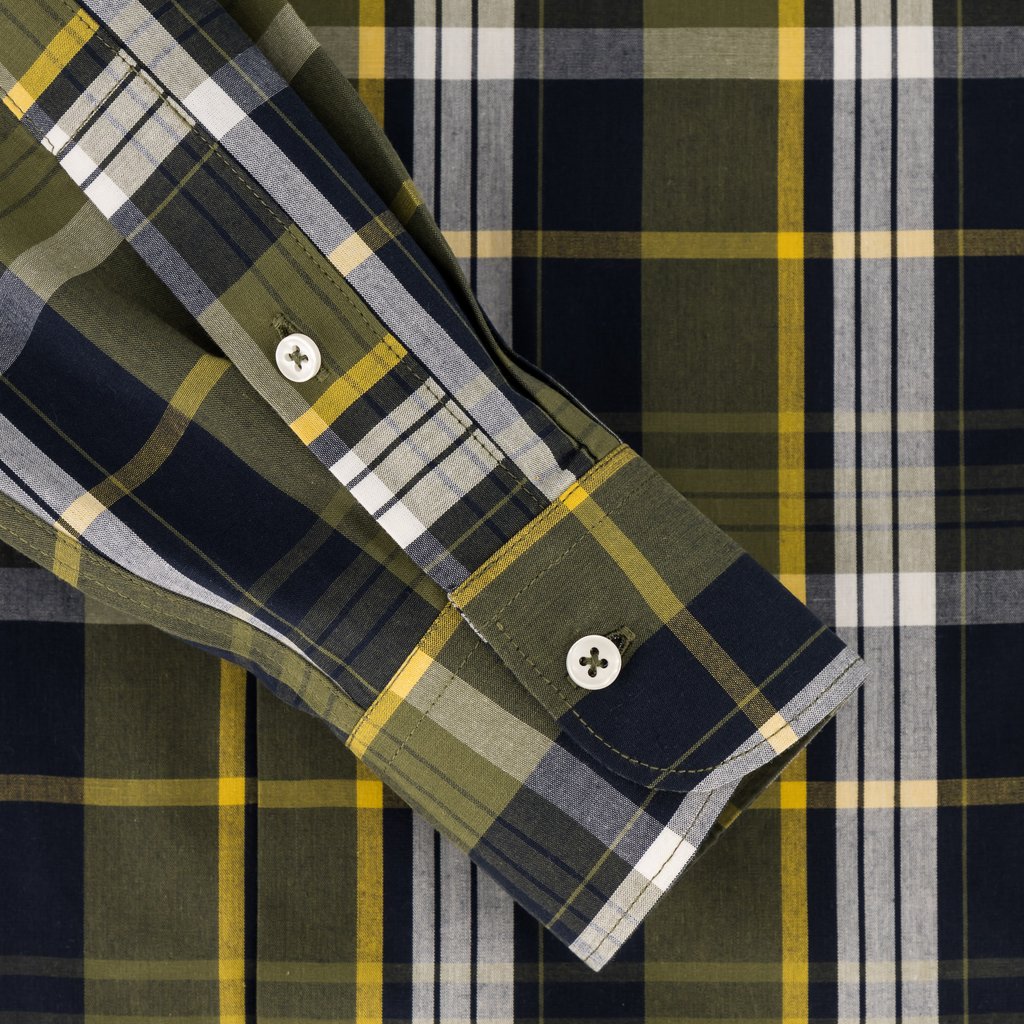 Add a splash of color and pattern to your wardrobe with this navy and yellow madras check dress shirt. Made for those who value both fashion and function, this shirt offers a slim fit that ensures a sleek, contemporary silhouette. The semi-cutaway collar strikes a balance between classic and modern, providing a versatile look for both professional and casual settings. Single cuffs offer simplicity and elegance, while sewn-in collar stays maintain the shirt’s crisp appearance. Care is easy with machine washing at 30 degrees, and to achieve the best look, iron while it’s still damp. Avoid tumble drying to keep the fabric in top condition. The French stitched side seams contribute to both the shirt’s durability and comfort, ensuring comfortable wear while maintaining a high-quality finish.