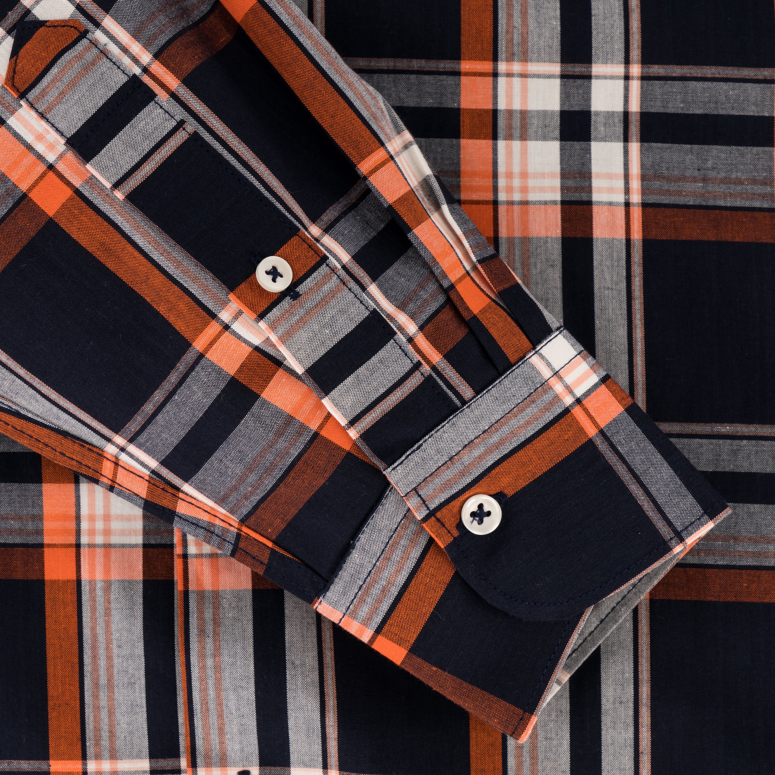 Make a statement with this Slim Fit Orange and Black Check Dress Shirt, designed for the man who isn’t afraid to stand out. Made from 100% cotton, this shirt offers comfort alongside a vibrant, eye-catching pattern that’s perfect for adding a splash of personality to any formal or semi-formal outfit. The slim fit ensures a flattering, contemporary silhouette, while the full cutaway collar provides a modern, bold look. Single cuffs maintain the shirt’s versatility for day-to-day wear, and the bonded collar stays keep the collar structured and sharp all day. This shirt is easy to care for, being machine washable at 30 degrees; for an impeccable finish, simply iron while the fabric is damp. Whether for business or pleasure, this shirt is an excellent choice for those who appreciate both style and substance.