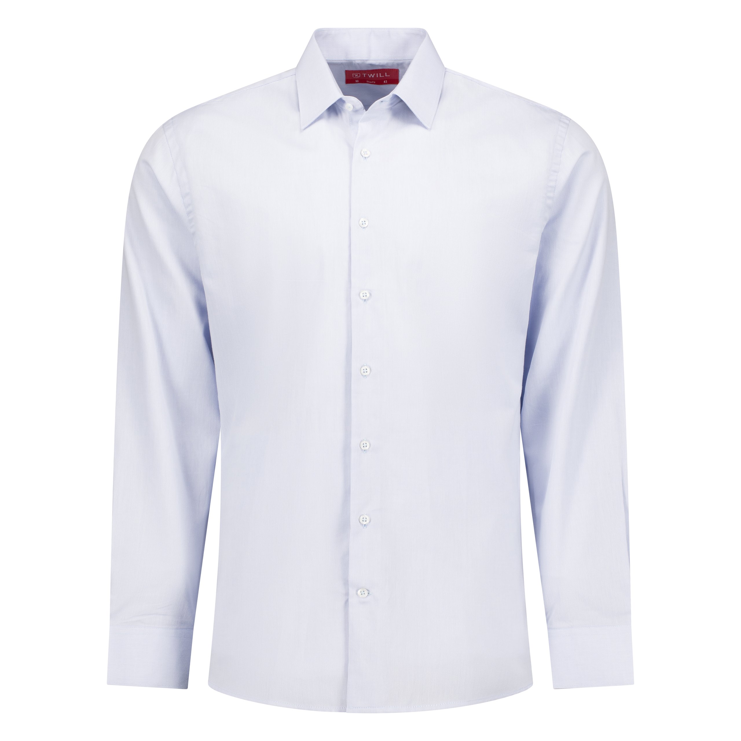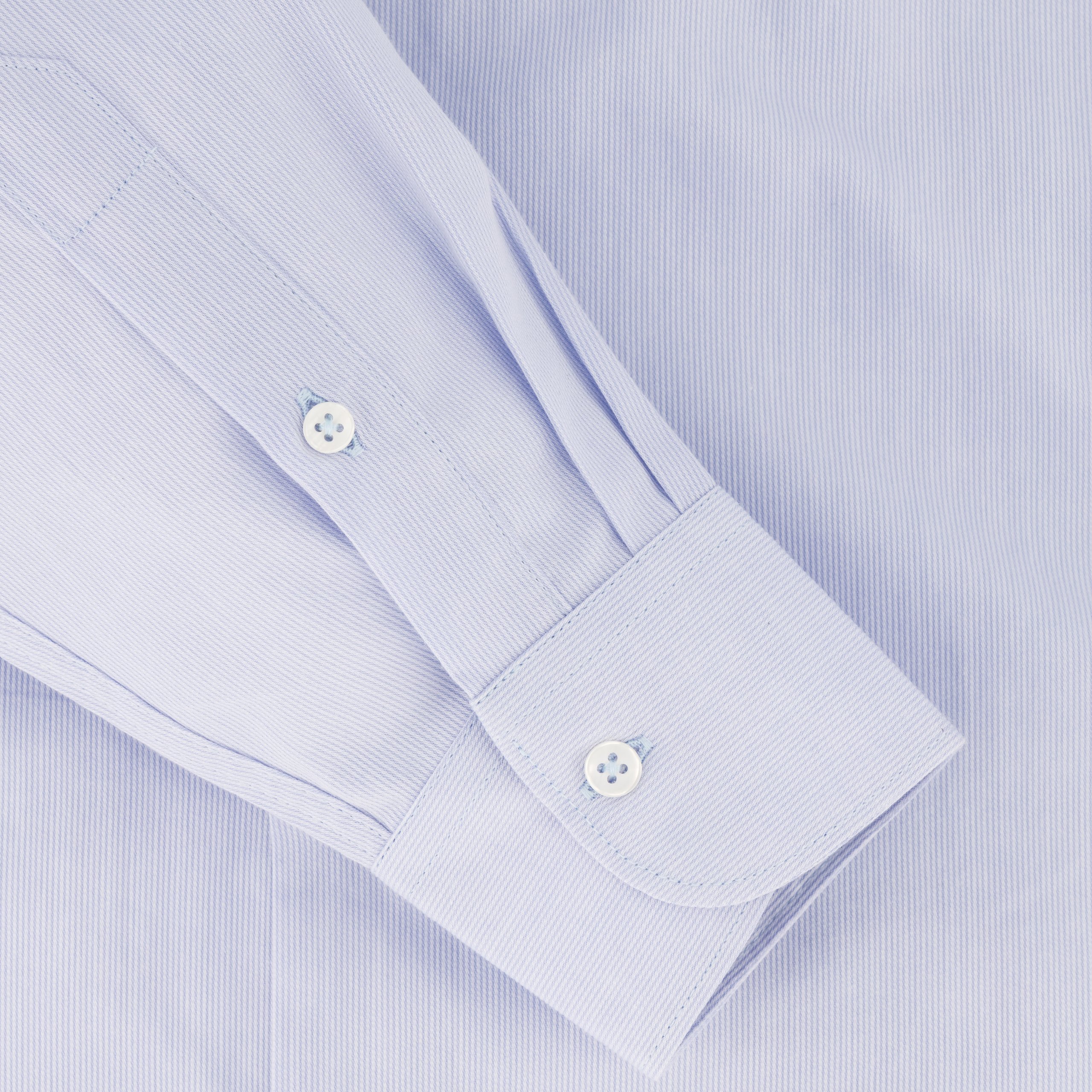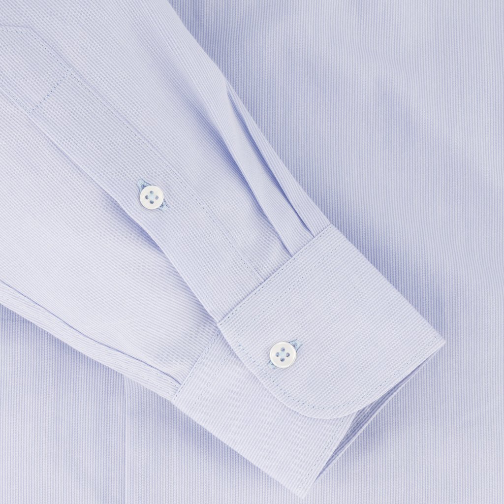 This pale blue fine stripe dress shirt is the epitome of modern elegance, tailored for the man who values both style and comfort. Crafted from 100% cotton, this shirt provides a luxurious feel with the breathability needed for all-day wear. The fine stripes offer a nuanced sophistication, making it versatile enough for both business and evening wear. The semi-cutaway collar adds a touch of contemporary flair, while the single cuffs maintain a classic appeal. Designed with a slim fit, it contours to the body for a sharp, tailored look. Additionally, the bonded collar stays ensure that the collar remains crisp and well-shaped throughout the day, making this shirt an excellent choice for any formal occasion.