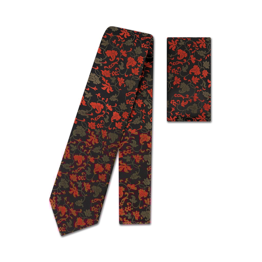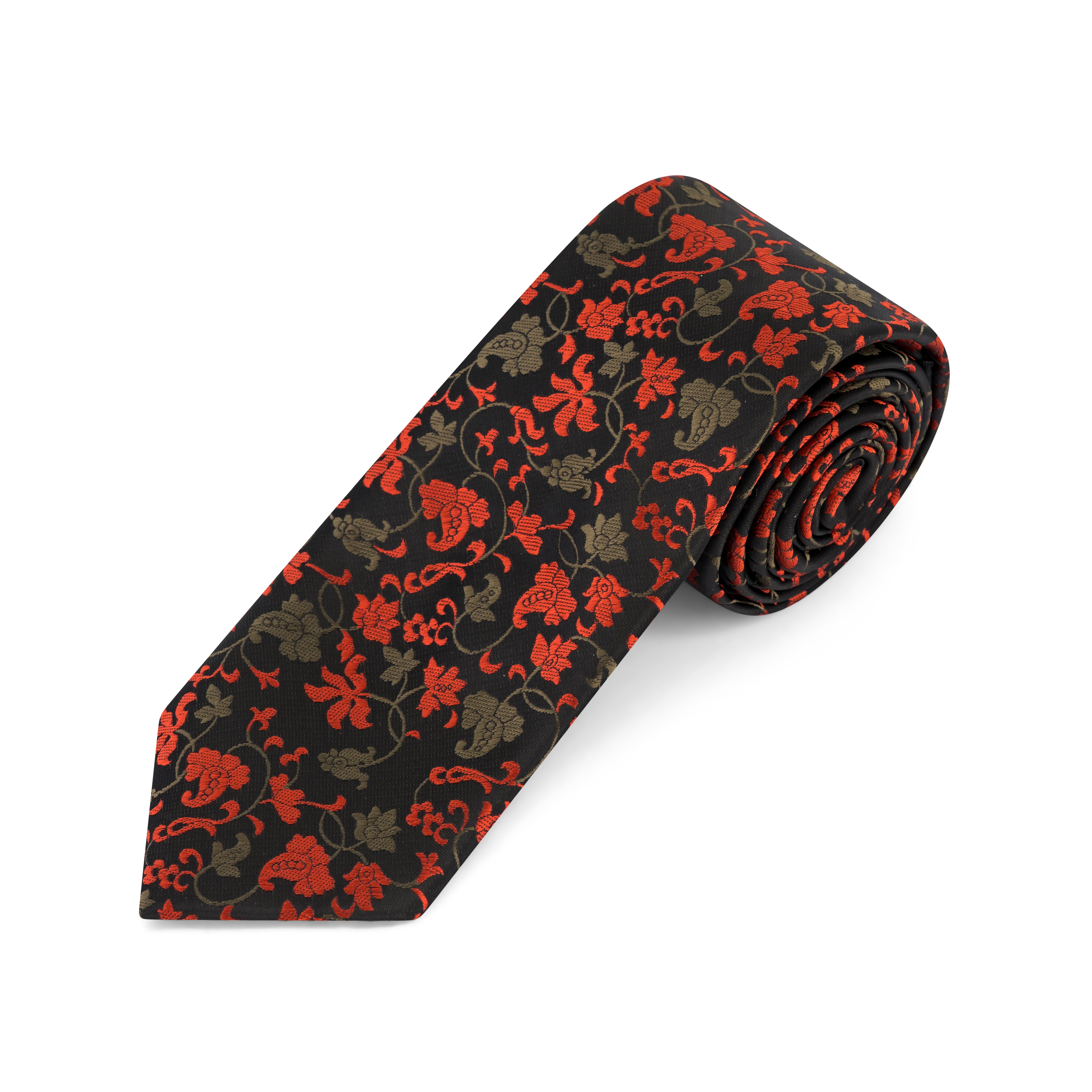 Striking and sophisticated, this Red & Beige on Black Floral Tie & Pocket Square Set brings bold contrast to your formalwear. The deep black background is adorned with a woven floral design in rich red and soft beige tones, creating a refined and eye-catching look. Made from premium microfibre and paired with a matching pocket square, this set is perfect for evening events or standout style.