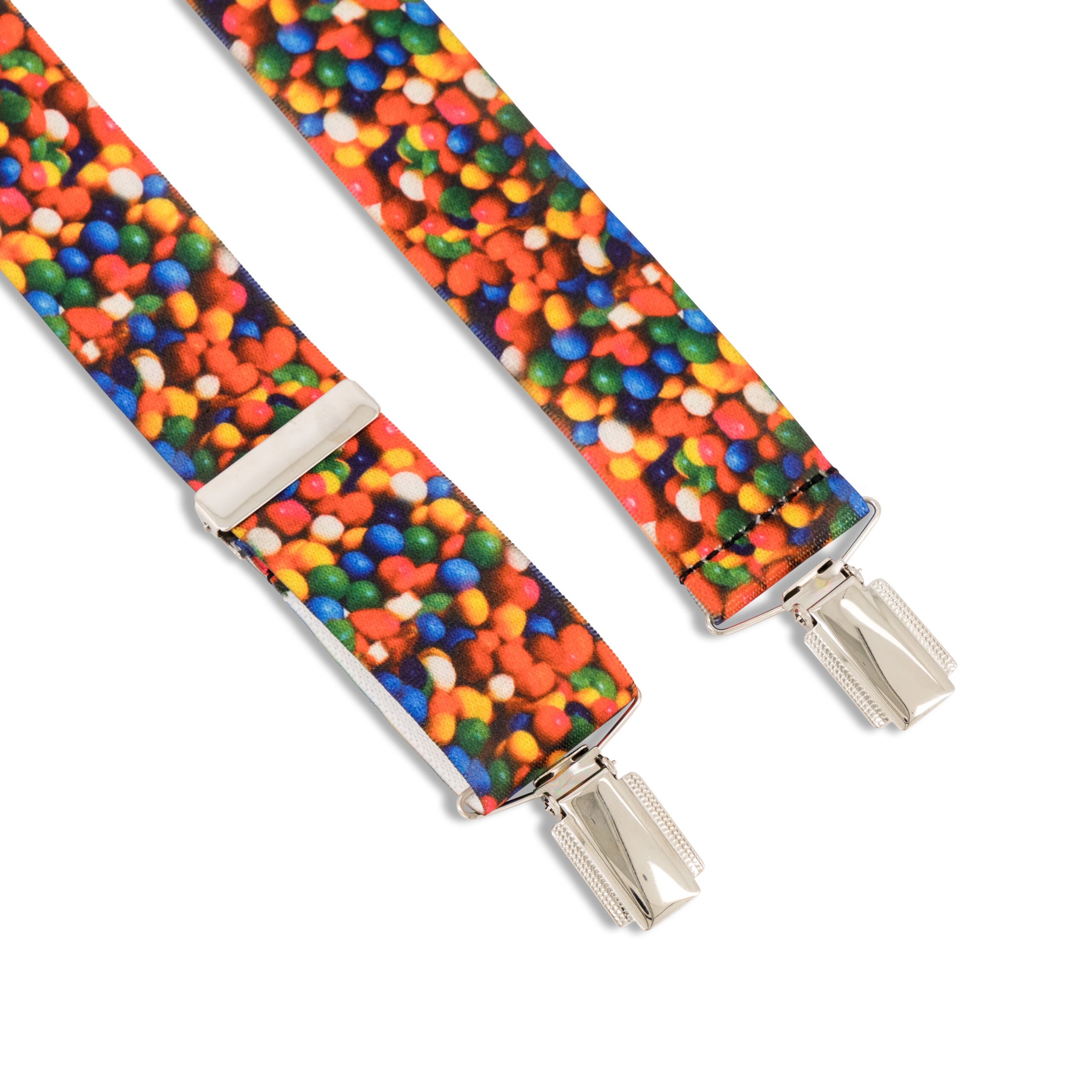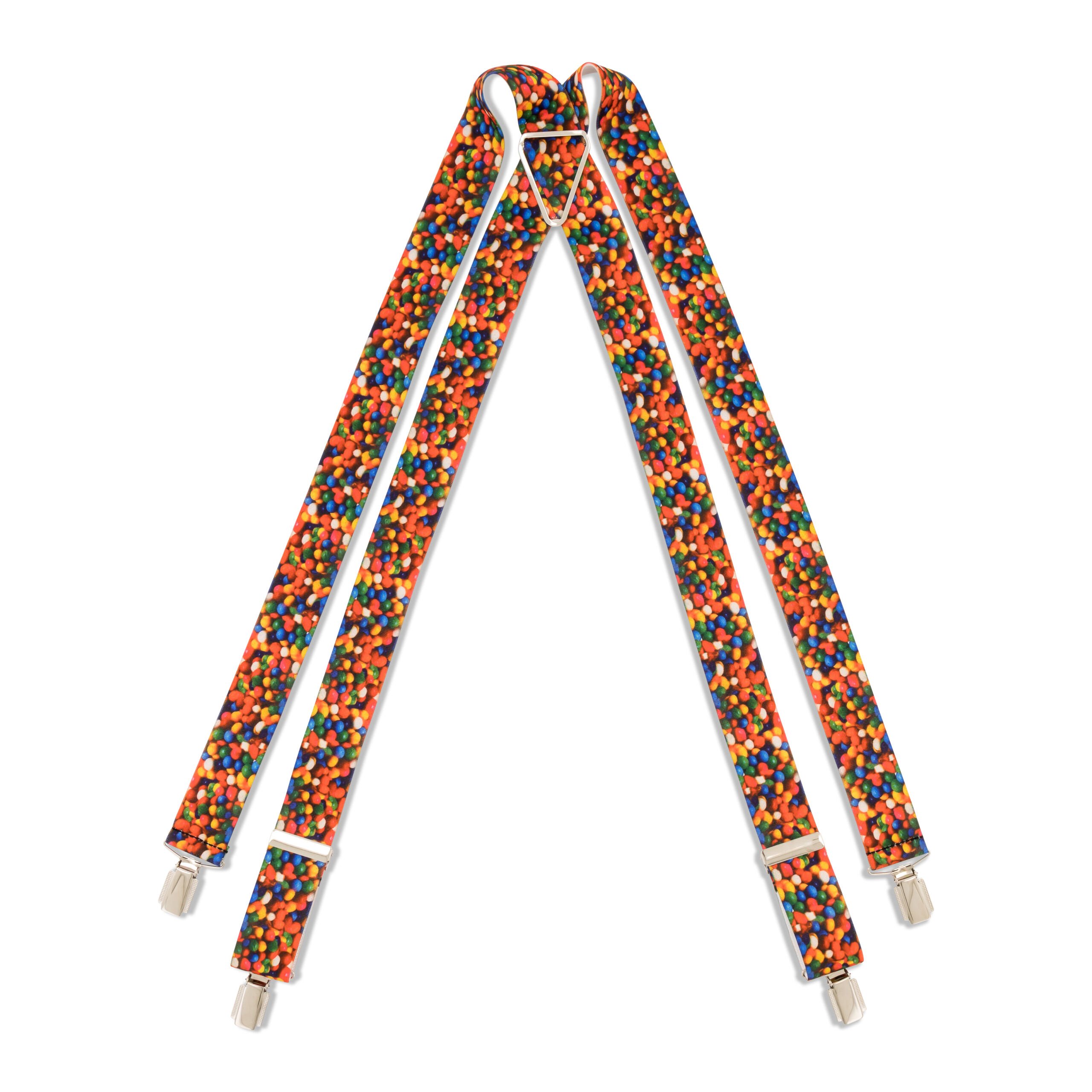 These fun and fashionable braces feature a one-size-fits-all nylon stretch design with a playful skittle print. The four-clip system ensures a secure fit, and the polished silver-finish waistband clips add a touch of sophistication.