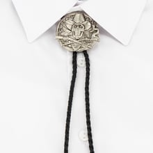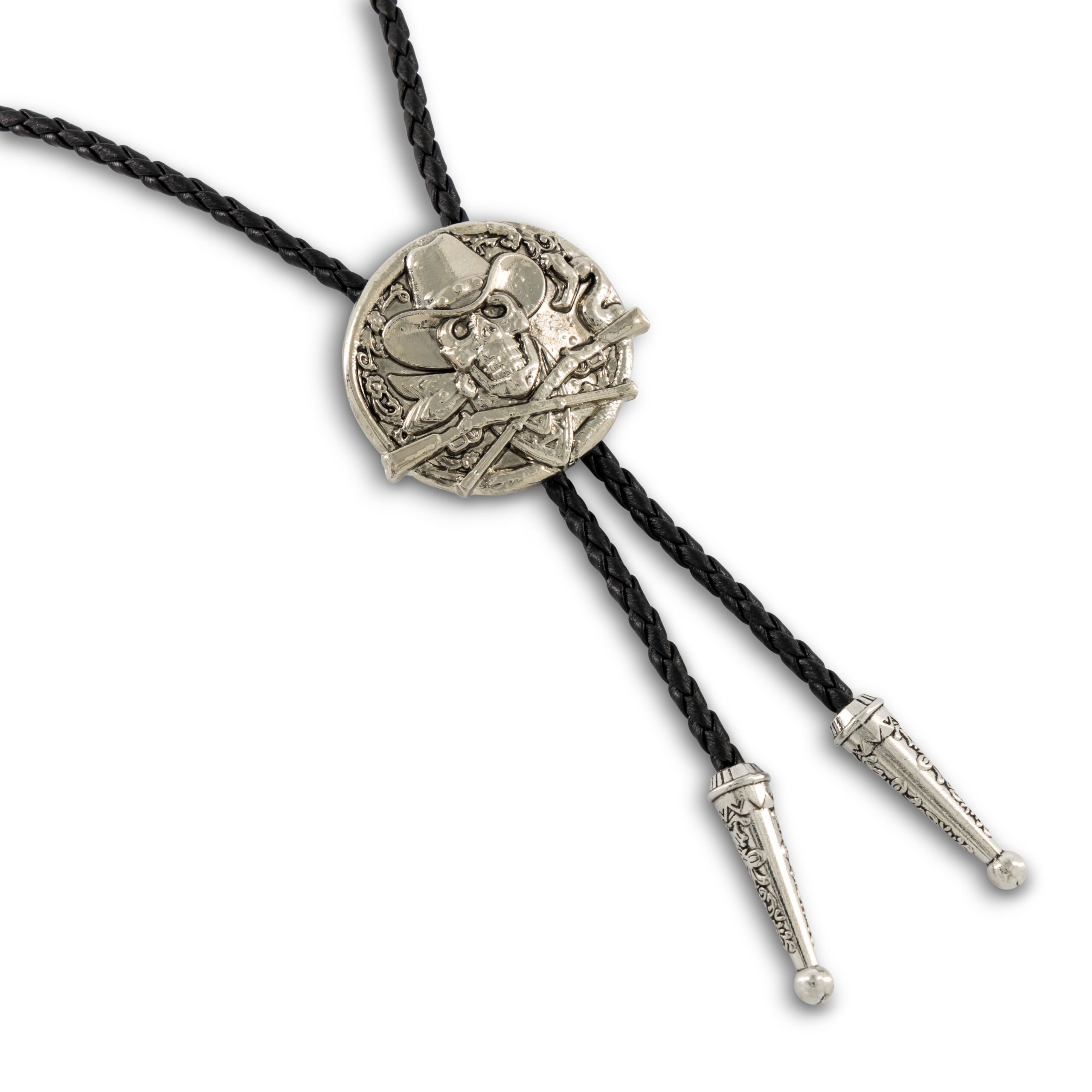 - Design: Skull cowboy bolo tie with crossed rifles and engraved cord binders
