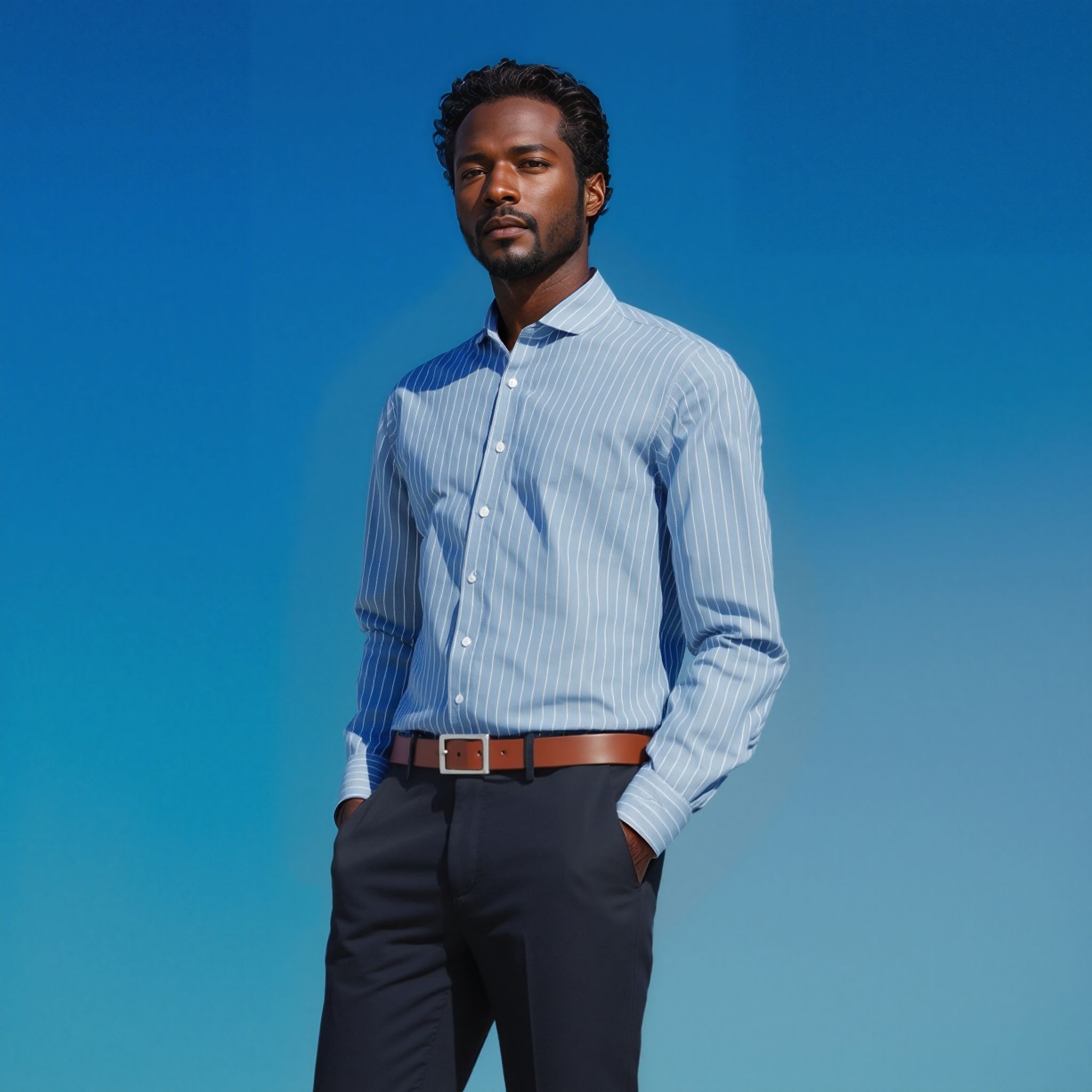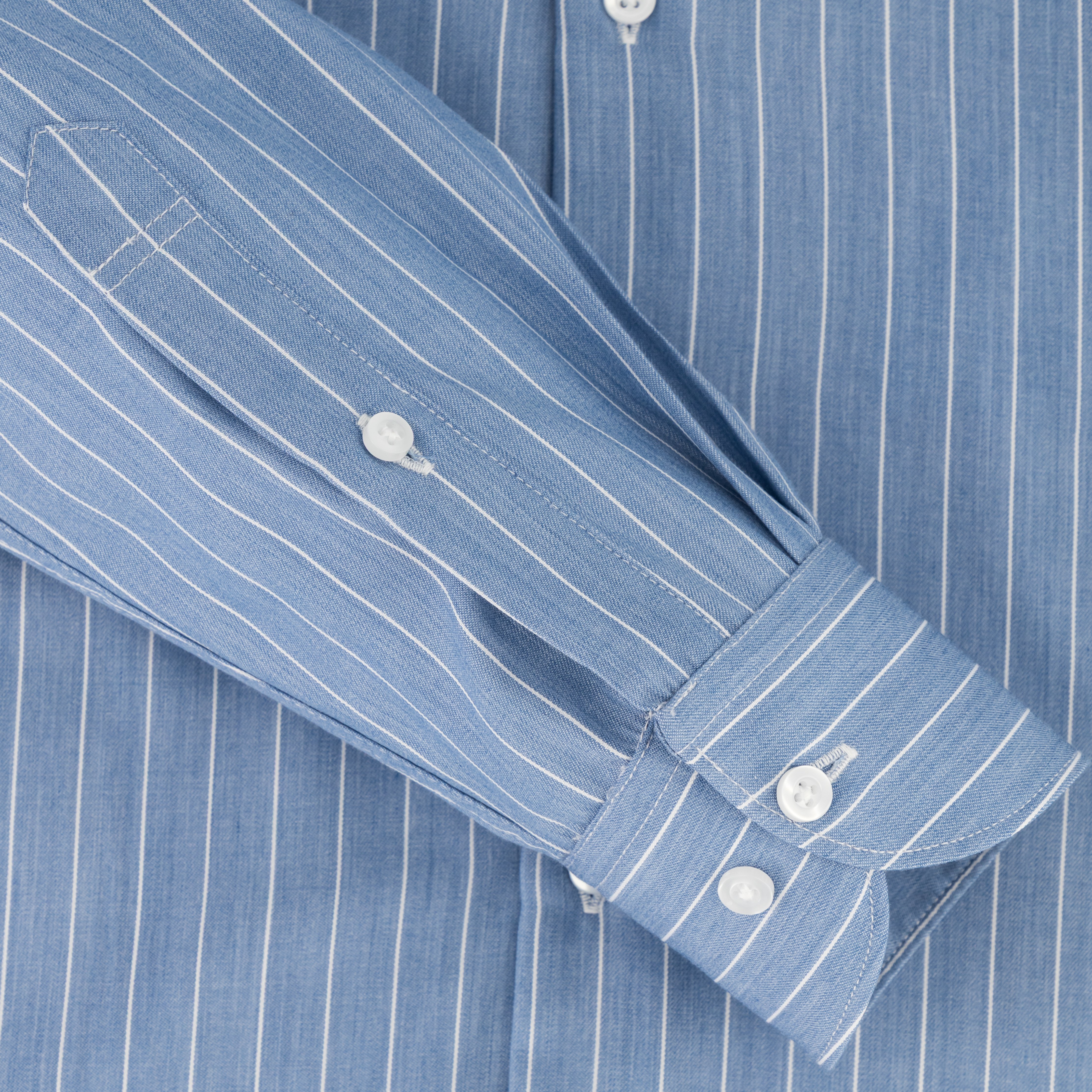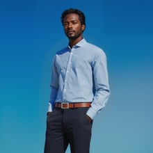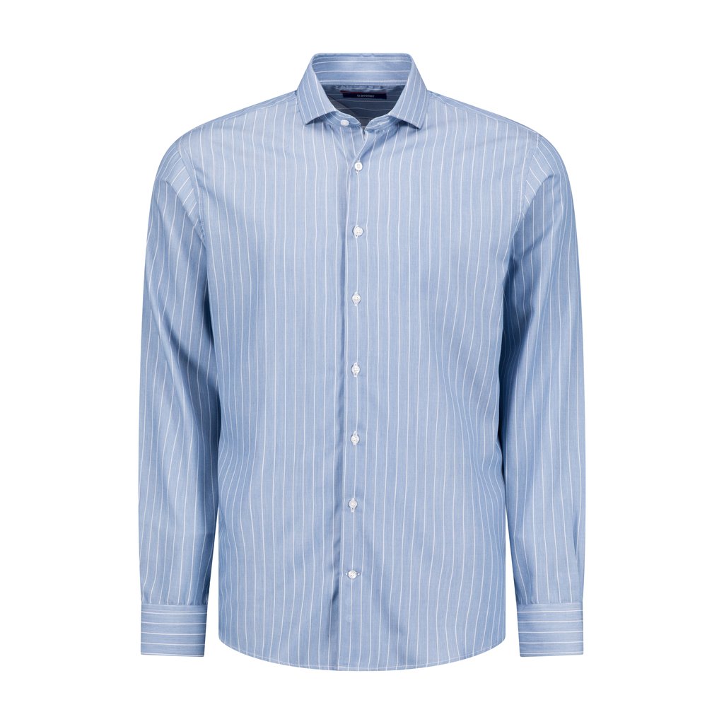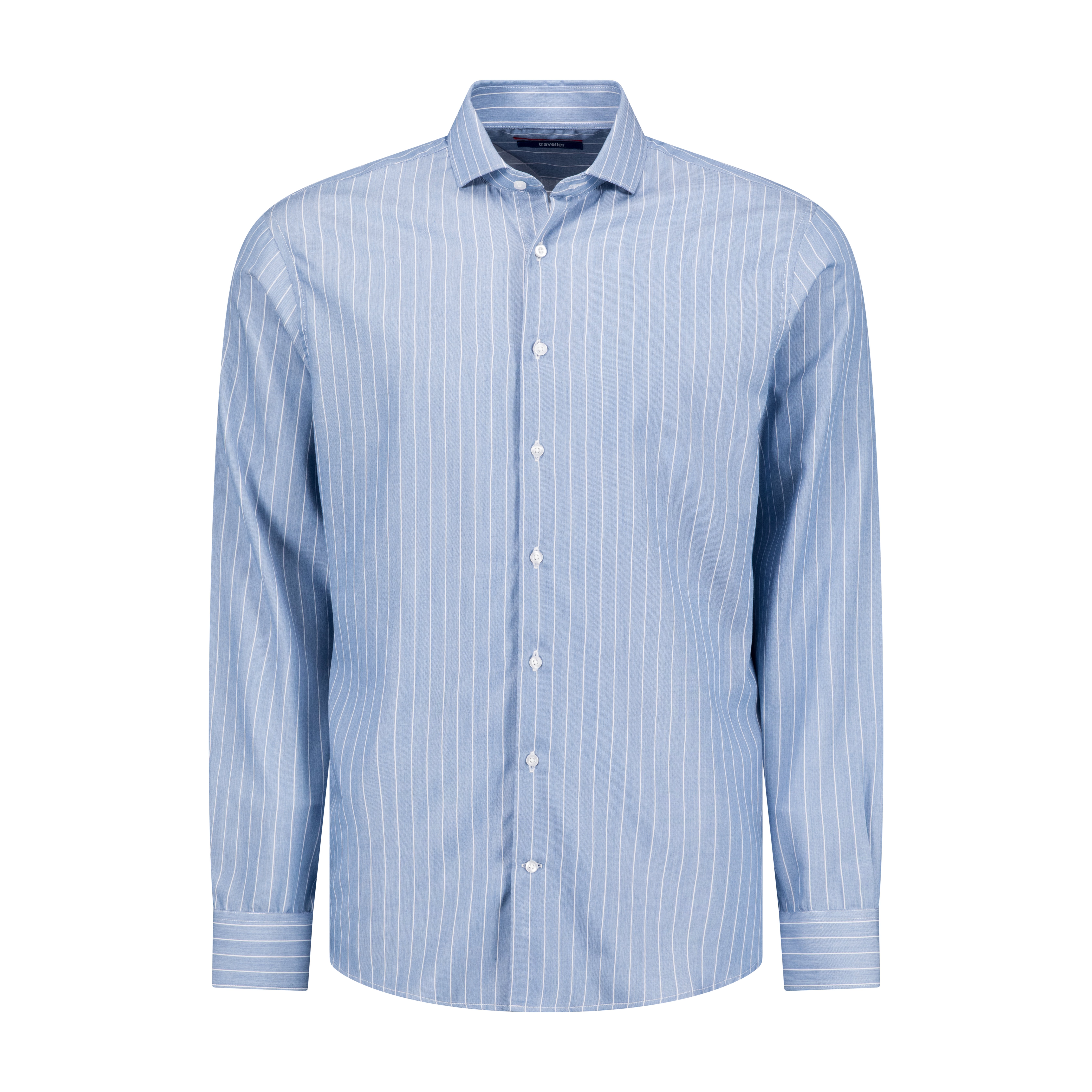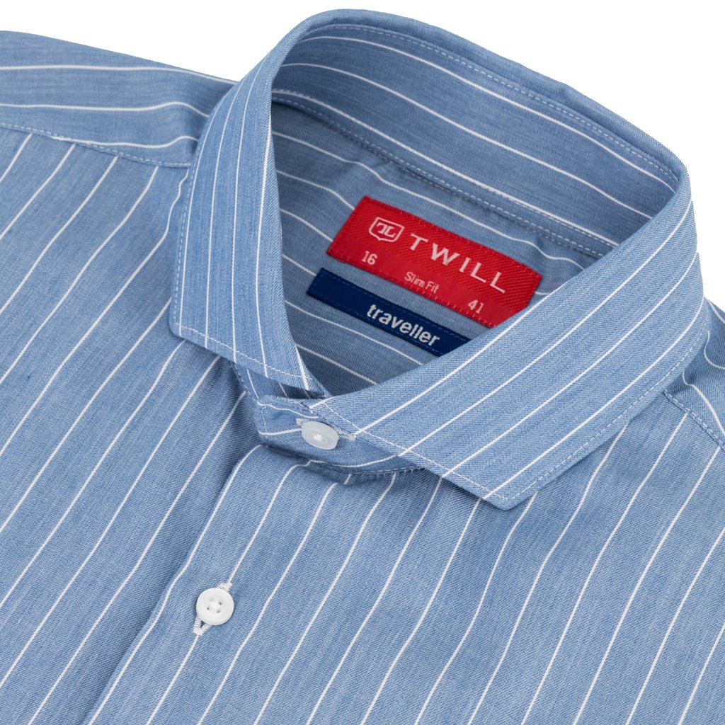Crafted from cotton-rich fabric, this teal chalk stripe dress shirt from the Traveller Collection combines striking style with practicality. The slim fit design offers a modern, streamlined silhouette, while the bold teal chalk stripe pattern adds a distinctive flair suitable for both professional and formal settings. The full cutaway collar, featuring fixed collar stays, ensures a sharp, polished appearance. Single cuffs provide a clean, versatile finish, perfect for everyday wear. Designed for convenience, this shirt is easy to iron and care for, making it ideal for the on-the-go gentleman. Machine wash at 30°C for effortless maintenance. A perfect blend of sophistication and functionality for the discerning wardrobe.