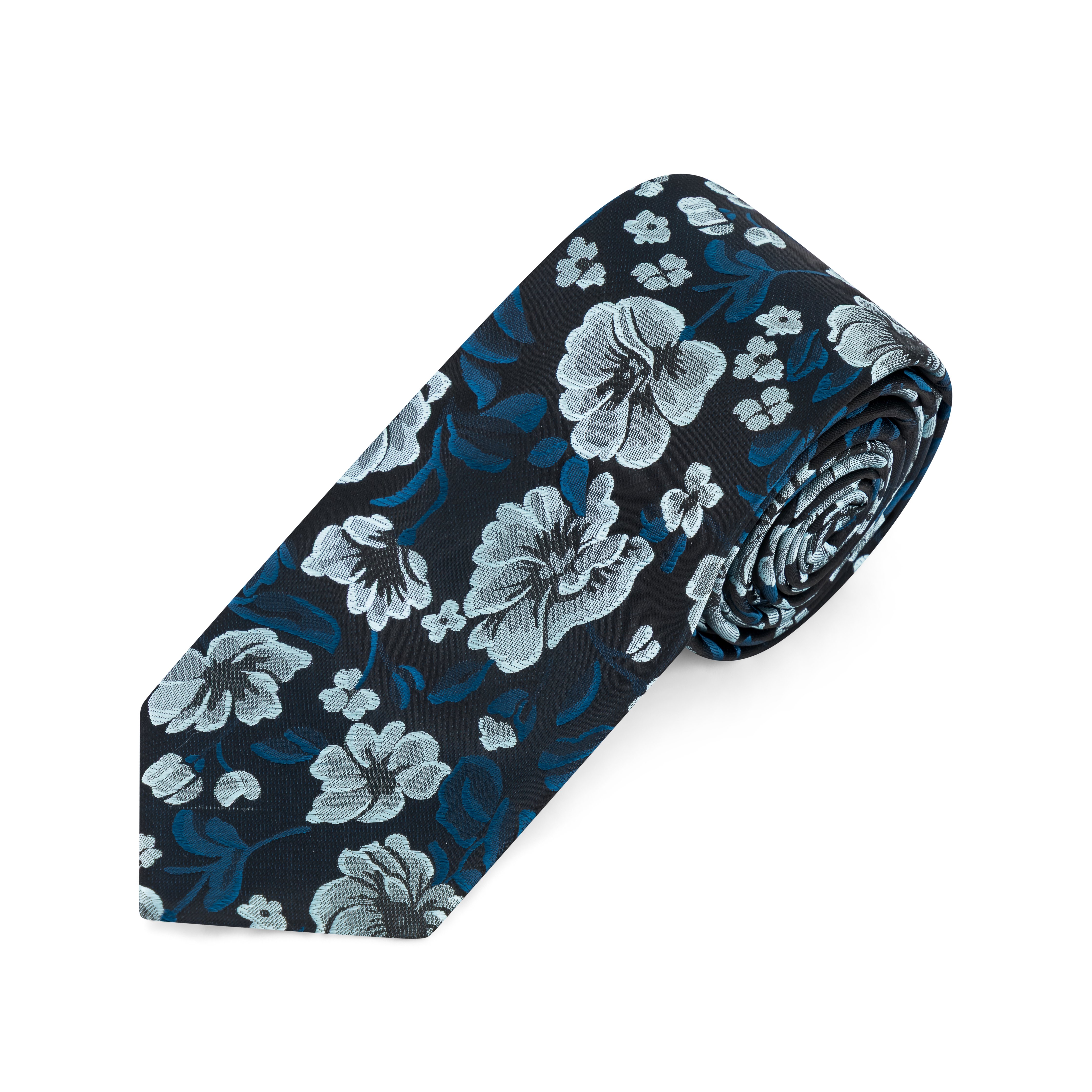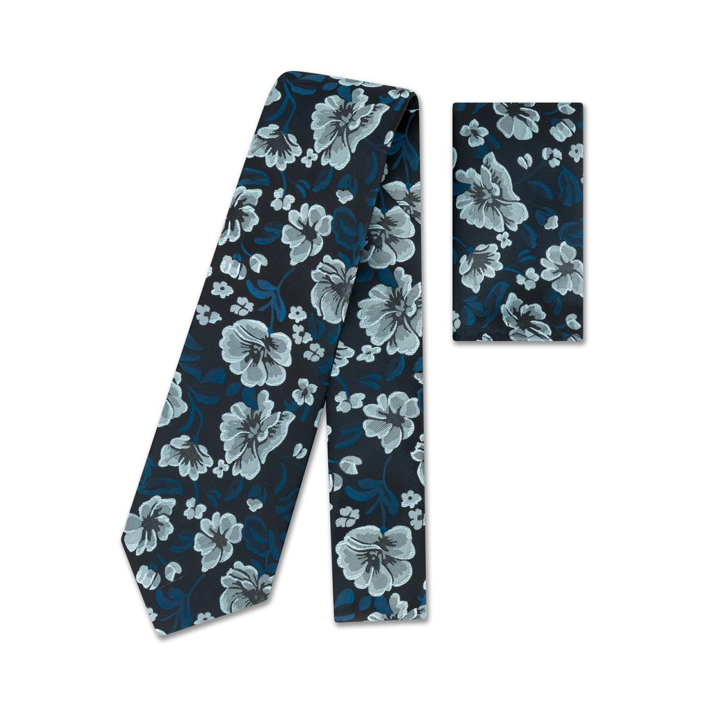 A confident blend of classic and contemporary, this tie features a crisp white and soft blue floral pattern set against a rich black background. The contrast delivers a bold yet elegant statement, perfect for weddings, events, or elevating your weekday wardrobe.