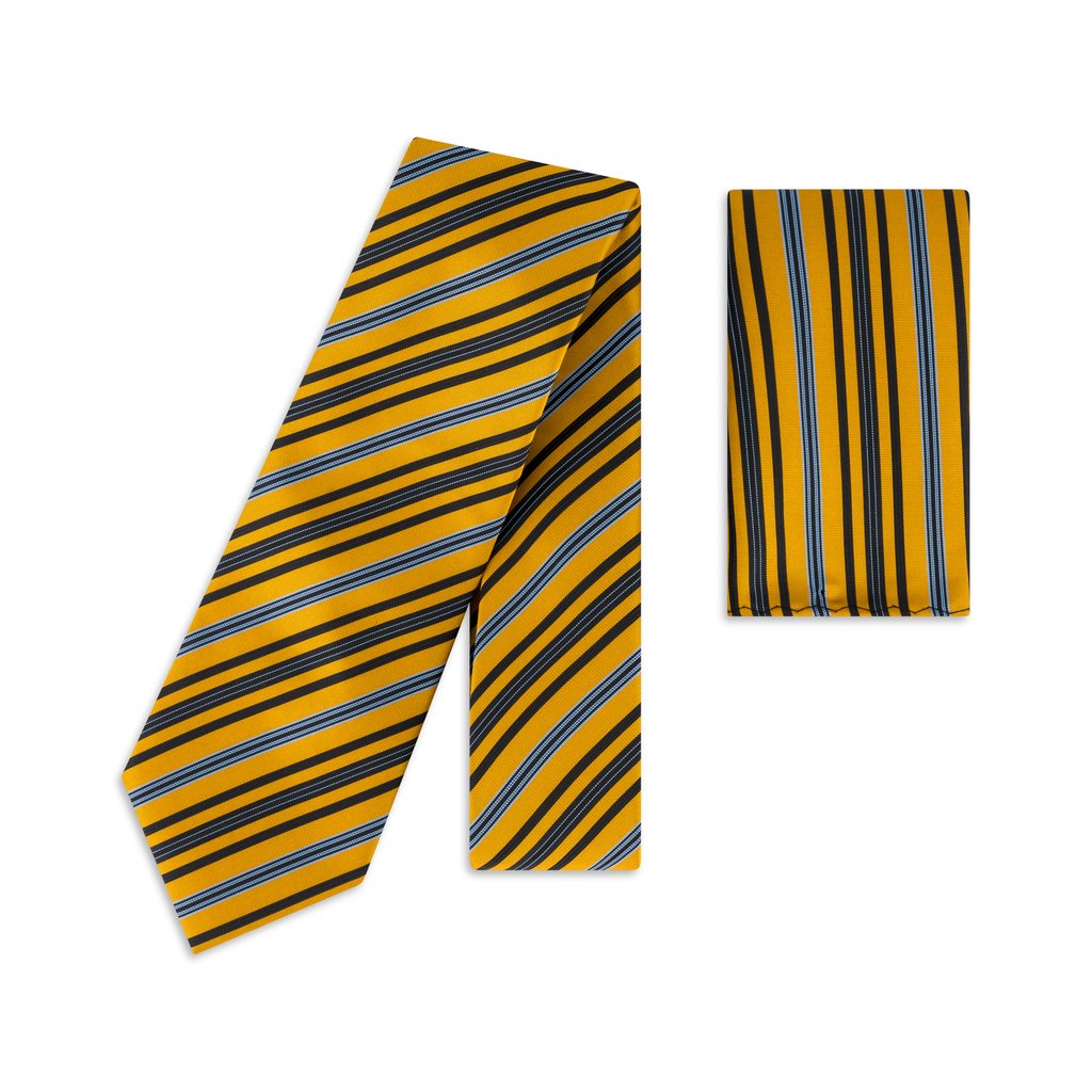 Bolster your formal attire with this Gold Striped Woven Tie and Matching Pocket Square Set, a sophisticated choice for the modern gentleman. This set showcases a radiant gold base, intricately accented with sharp blue and black stripes, offering a perfect balance of opulence and refinement. Crafted from 100% premium microfibre, the tie delivers a sumptuous feel and impeccable drape, measuring 7.5 cm in width and 150 cm in length for a distinguished silhouette. Complemented by a matching pocket square, this ensemble is ideal for upscale events, from gala evenings to executive gatherings. Preserve its luxurious appeal with careful hand washing; tumble drying is not recommended.
