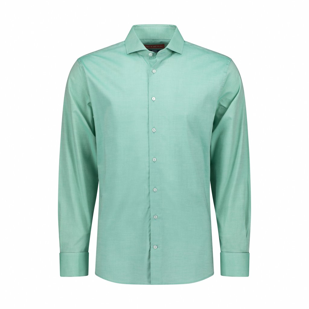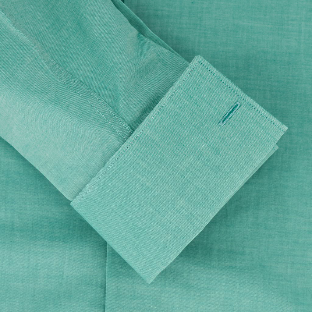 Make a statement with this unique pine green dress shirt. Crafted from 100% superior cotton, it features a slim fit and full cut away collar for a sharp, professional look. The chambray weave gives it a subtle texture, while the double cuffs add a touch of sophistication. The inset collar stiffeners ensure a crisp, sharp collar point that stays in place all day. Perfect for business meetings or formal events where you want to stand out from the crowd.